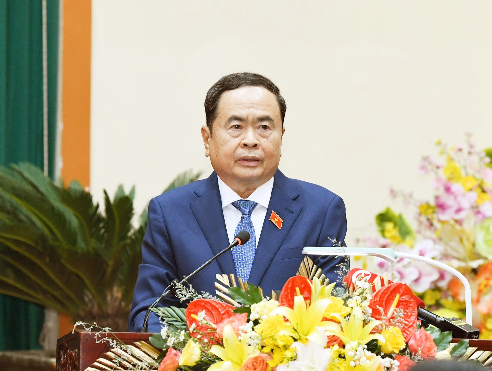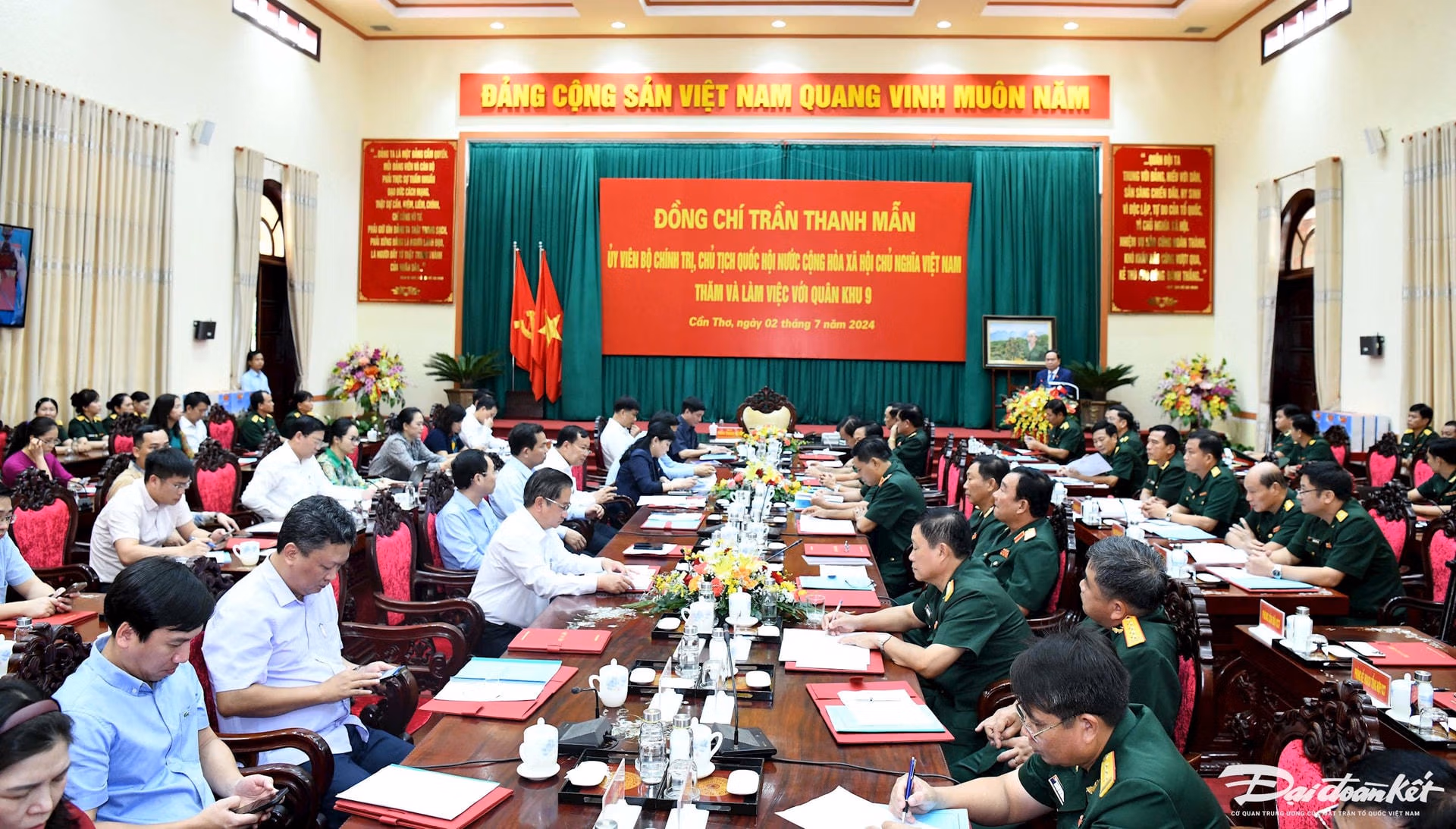 Phát biểu tại buổi làm việc, Chủ tịch Quốc hội Trần Thanh Mẫn vui mừng đến thăm và làm việc với Đảng ủy - Bộ Tư lệnh Quân khu 9 trong không khí toàn Đảng, toàn dân, toàn quân thi đua lập thành tích hướng tới kỷ niệm 79 năm Cách mạng Tháng 8 và Quốc khánh 2/9, kỷ niệm 80 năm Ngày thành lập Quân đội nhân dân Việt Nam và 35 năm Ngày hội quốc phòng toàn dân.