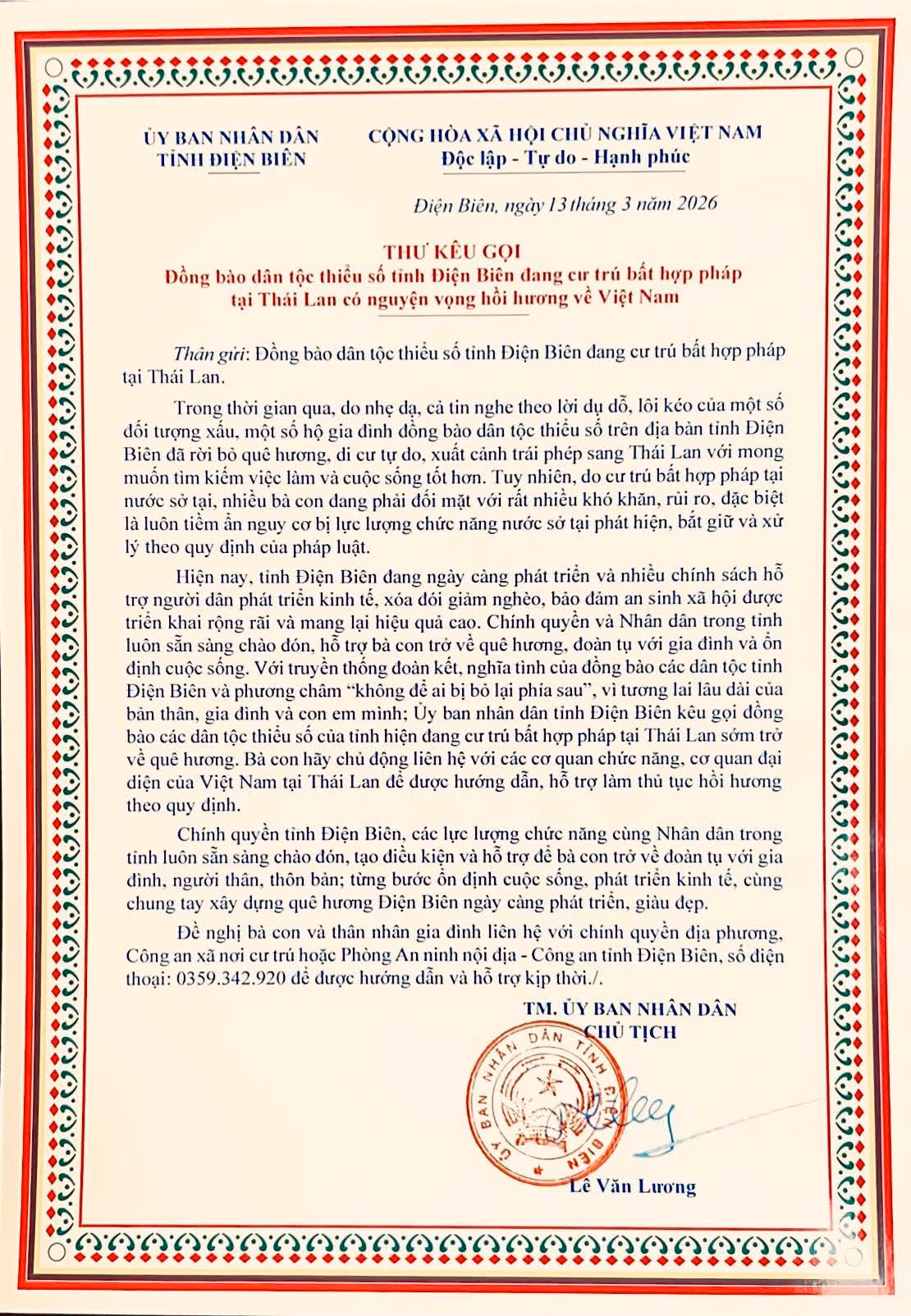 Trước thực trạng một số gia đình người đồng bào dân tộc thiểu số tỉnh Điện Biên cư trú bất hợp pháp tại Thái Lan, có nguy cơ đối mặt với những rủi ro, vi phạm về mặt pháp lý, Chủ tịch UBND tỉnh Điện Biên đã có Thư kêu gọi đồng bào hồi hương về Việt Nam.