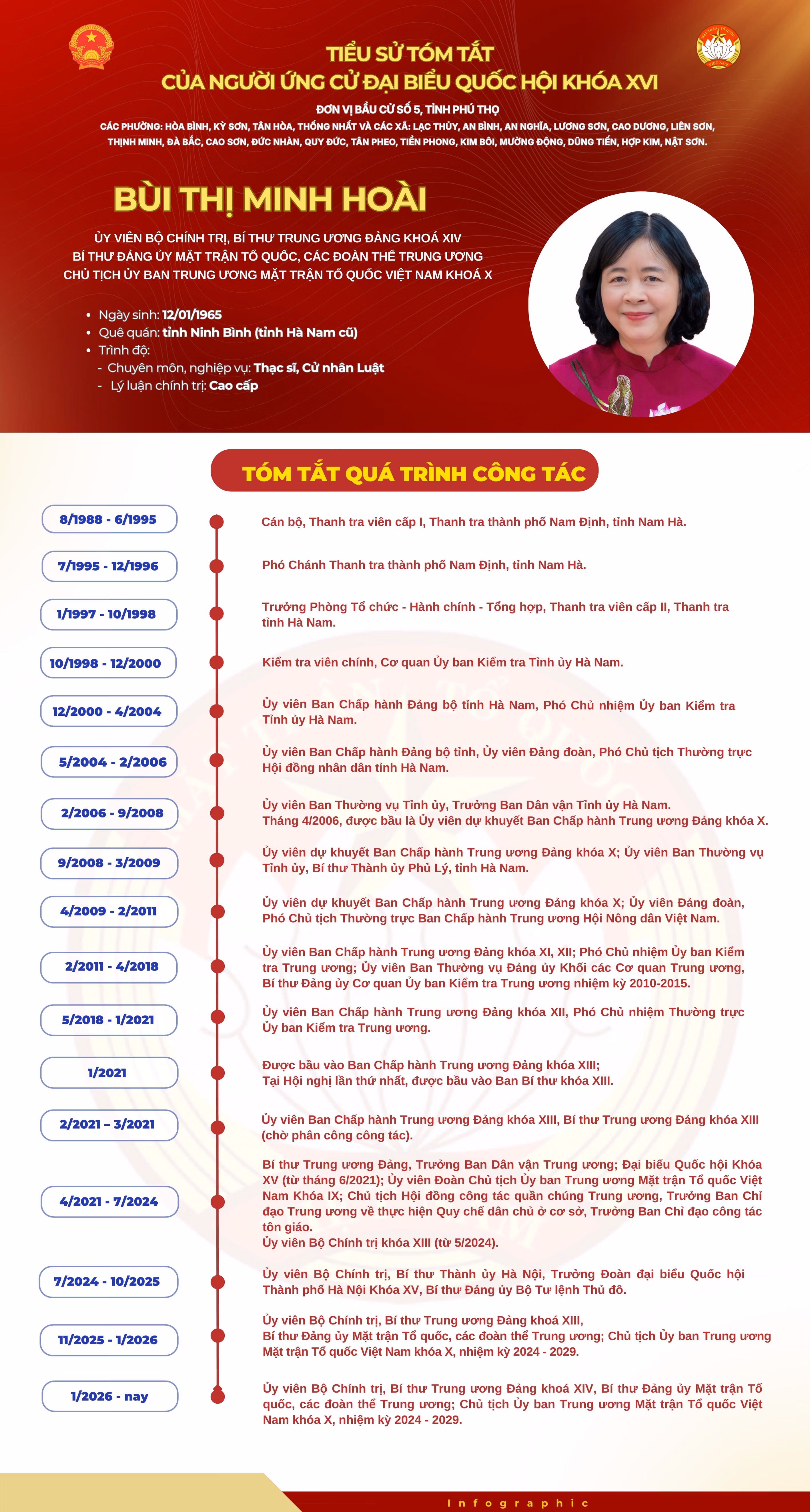 Bà Bùi Thị Minh Hoài - Ủy viên Bộ Chính trị, Bí thư Trung ương Đảng, Bí thư Đảng ủy Mặt trận Tổ quốc, các đoàn thể Trung ương, Chủ tịch Ủy ban Trung ương Mặt trận Tổ quốc Việt Nam ứng cử Đại biểu Quốc hội khóa XVI tại tỉnh Phú Thọ, đơn vị bầu cử số 5 gồm các phường: Hòa Bình, Kỳ Sơn, Tân Hòa, Thống Nhất và các xã: Lạc Thủy, An Bình, An Nghĩa, Lương Sơn, Cao Dương, Liên Sơn, Thịnh Minh, Đà Bắc, Cao Sơn, Đức Nhàn, Quy Đức, Tân Pheo, Tiền Phong, Kim Bôi, Mường Động, Dũng Tiến, Hợp Kim, Nật Sơn.