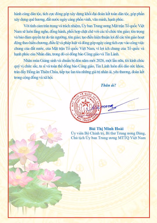 Nhân dịp Lễ Giáng sinh 2025, thay mặt Ủy ban Trung ương Mặt trận Tổ quốc Việt Nam, bà Bùi Thị Minh Hoài, Ủy viên Bộ Chính trị, Bí thư Trung ương Đảng, Chủ tịch Ủy ban Trung ương Mặt trận Tổ quốc Việt Nam đã gửi thư chúc mừng tới quý vị giáo phẩm, các vị chức sắc, tu sỹ cùng toàn thể đồng bào Kitô hữu Việt Nam.
