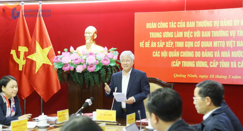 Ngày 18/3, Đoàn công tác của Ban Thường vụ Đảng ủy MTTQ, các đoàn thể Trung ương do đồng chí Đỗ Văn Chiến, Ủy viên Bộ Chính trị, Bí thư Trung ương Đảng, Chủ tịch Ủy ban Trung ương MTTQ Việt Nam, Bí thư Đảng ủy MTTQ, các đoàn thể Trung ương làm trưởng đoàn đã làm việc với Ban Thường vụ Tỉnh ủy về đề án sắp xếp, tinh gọn cơ quan MTTQ, các tổ chức chính trị - xã hội, các hội quần chúng do Đảng và Nhà nước giao nhiệm vụ trên địa bàn tỉnh. Làm việc với đoàn về phía tỉnh Quảng Ninh có các đồng chí: Vũ Đại Thắng,
