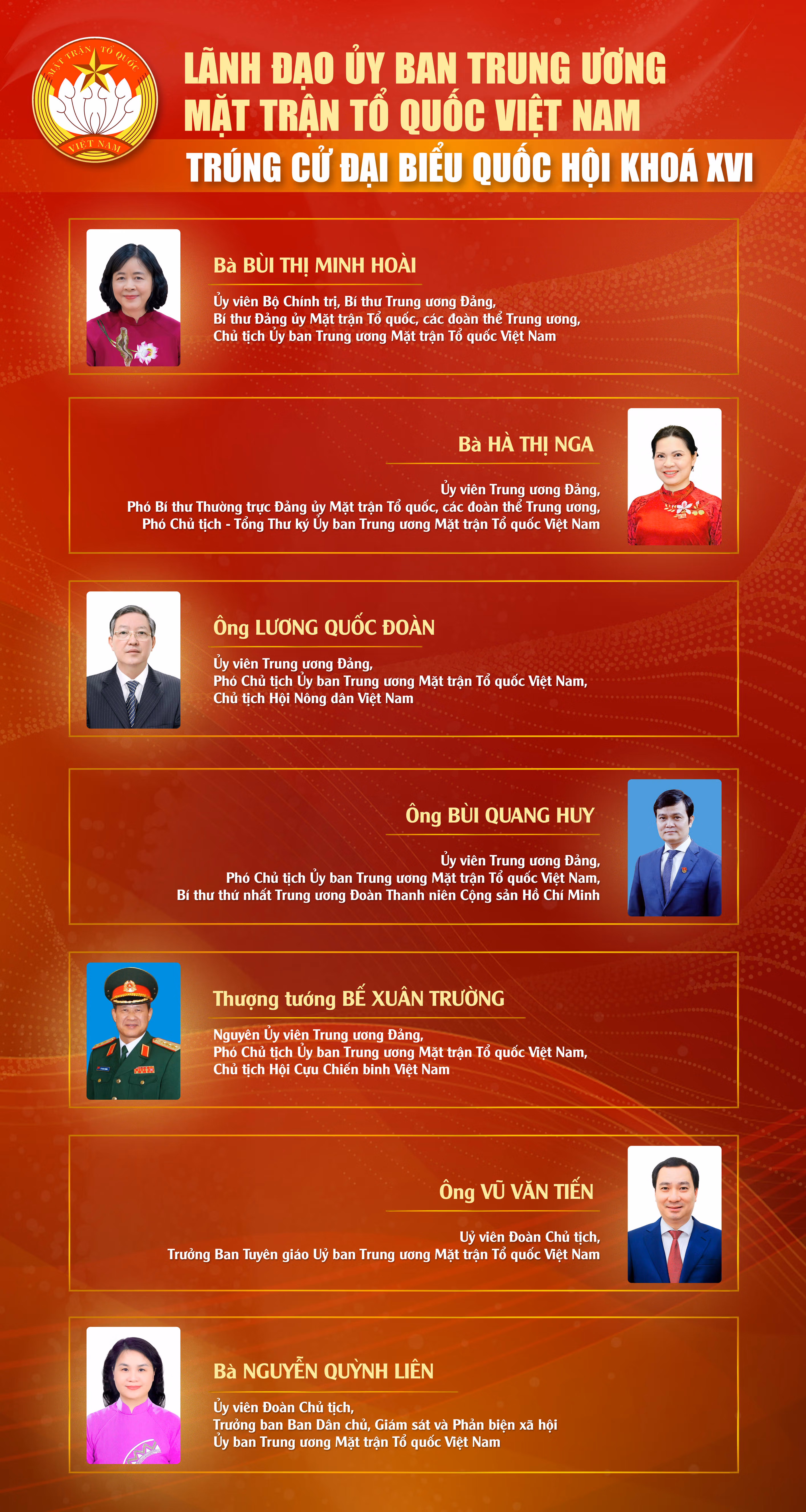 Ủy viên Bộ Chính trị, Bí thư Trung ương Đảng, Bí thư Đảng ủy MTTQ, các đoàn thể Trung ương, Chủ tịch UBTƯ MTTQ Việt Nam Bùi Thị Minh Hoài; Ủy viên Trung ương Đảng, Phó Chủ tịch – Tổng Thư ký UBTƯ MTTQ Việt Nam Hà Thị Nga cùng 5 vị Ủy viên Đoàn Chủ tịch Ủy ban Trung ương MTTQ Việt Nam đã trúng cử đại biểu Quốc hội khoá XVI.