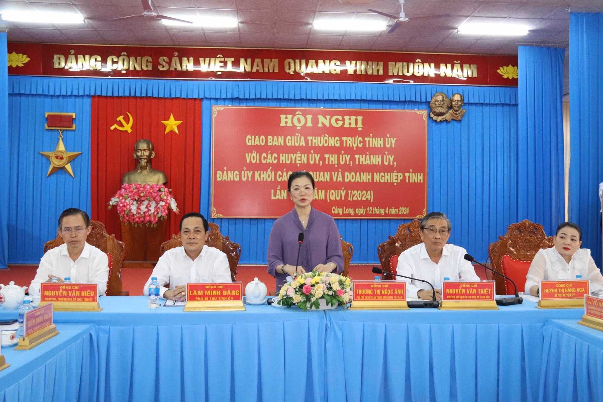 Chiều 12/4, tại huyện Càng Long, Trà Vinh đã diễn ra Hội nghị giao ban giữa Thường trực tỉnh uỷ với các Huyện uỷ, Thị uỷ, Thành uỷ, Đảng uỷ khối các cơ quan và doanh nghiệp tỉnh lần thứ 5. Phó Chủ tịch UBTƯ MTTQ Việt Nam Trương Thị Ngọc Ánh cùng tham dự. Tại đây, các đại biểu đã thảo luận sâu về công tác giám sát, phản biện của MTTQ và các tổ chức chính trị - xã hội.