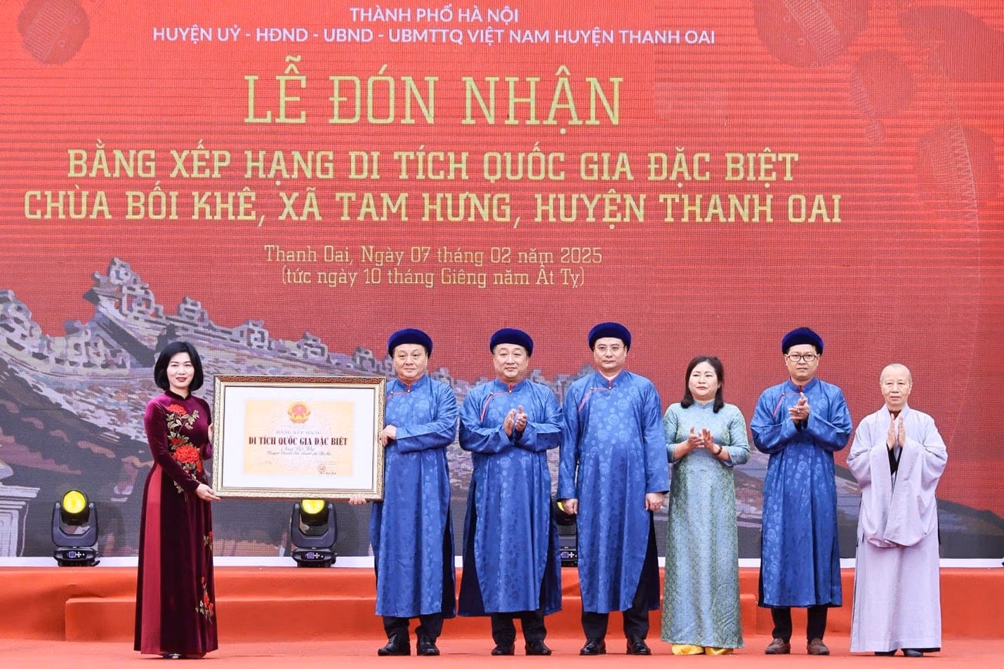 Sáng ngày 7/2 (tức ngày 10 tháng Giêng Ất Tỵ 2025), huyện Thanh Oai, TP Hà Nội tổ chức Lễ đón nhận Quyết định của Thủ tướng Chính phủ về việc xếp hạng Di tích quốc gia đặc biệt đối với chùa Bối Khê.