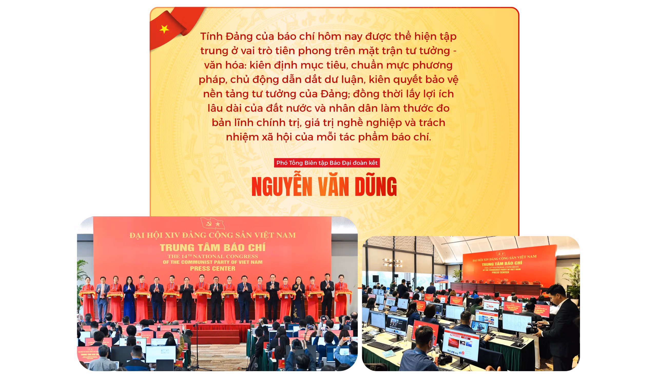 - Nhà báo Nguyễn Văn Dũng: Nhìn lại chặng đường phát triển của báo chí cách mạng Việt Nam, có thể thấy điều làm nên sức bền và vai trò đồng hành đặc biệt của báo chí trước hết nằm ở sự gắn bó mật thiết, bền chặt với nhân dân và Tổ quốc. Báo chí cách mạng ra đời và tồn tại không phải như một hoạt động nghề nghiệp thuần túy, mà như một bộ phận của sự nghiệp cách mạng, mang trong mình sứ mệnh phụng sự đất nước và phục vụ nhân dân.