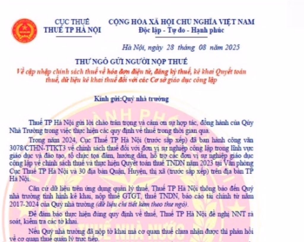 Thuế TP Hà Nội vừa có Thư ngỏ gửi người nộp thuế (NNT) cập nhập chính sách thuế về hóa đơn điện tử, đăng ký thuế, kê khai Quyết toán thuế, dữ liệu kê khai thuế đối với các Cơ sở giáo dục công lập.