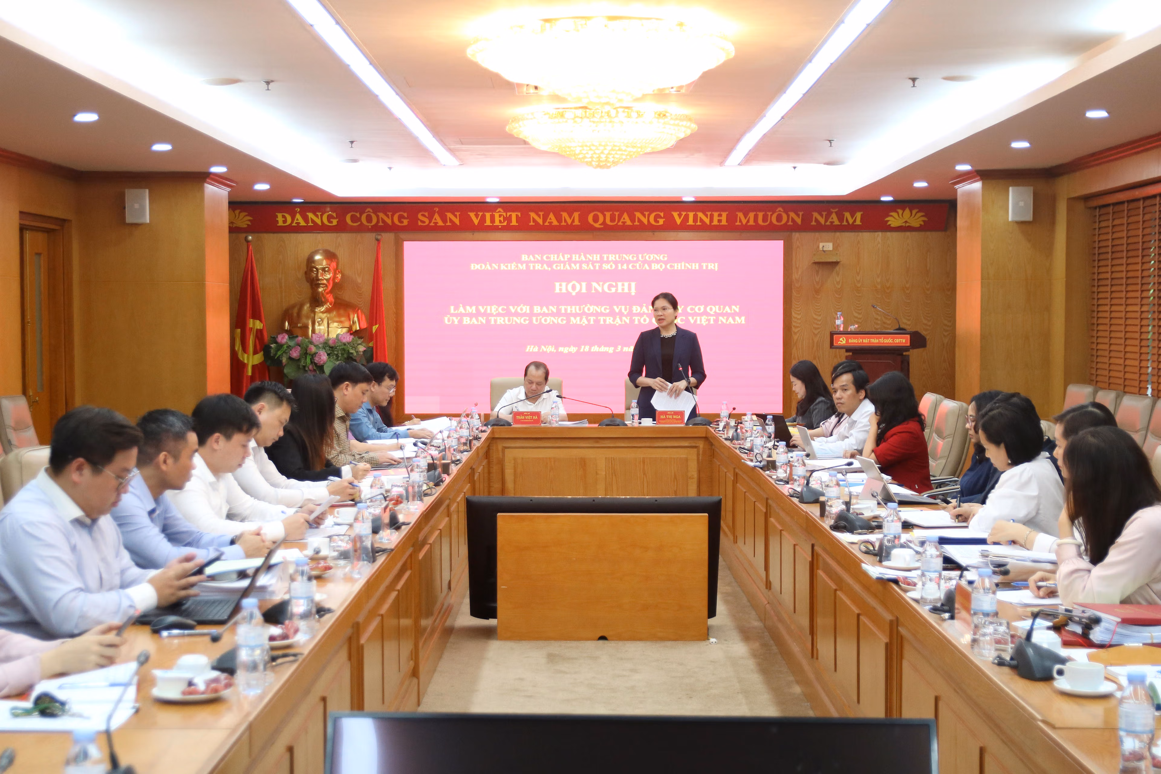 Chiều 18/3, tại Hà Nội, Đoàn Kiểm tra số 14 của Bộ Chính trị do đồng chí Trần Việt Hà - Ủy viên Ủy ban Kiểm tra Trung ương, Phó Trưởng Đoàn Kiểm tra đã có buổi làm việc với Ban Thường vụ Đảng ủy Cơ quan UBTƯ MTTQ Việt Nam.