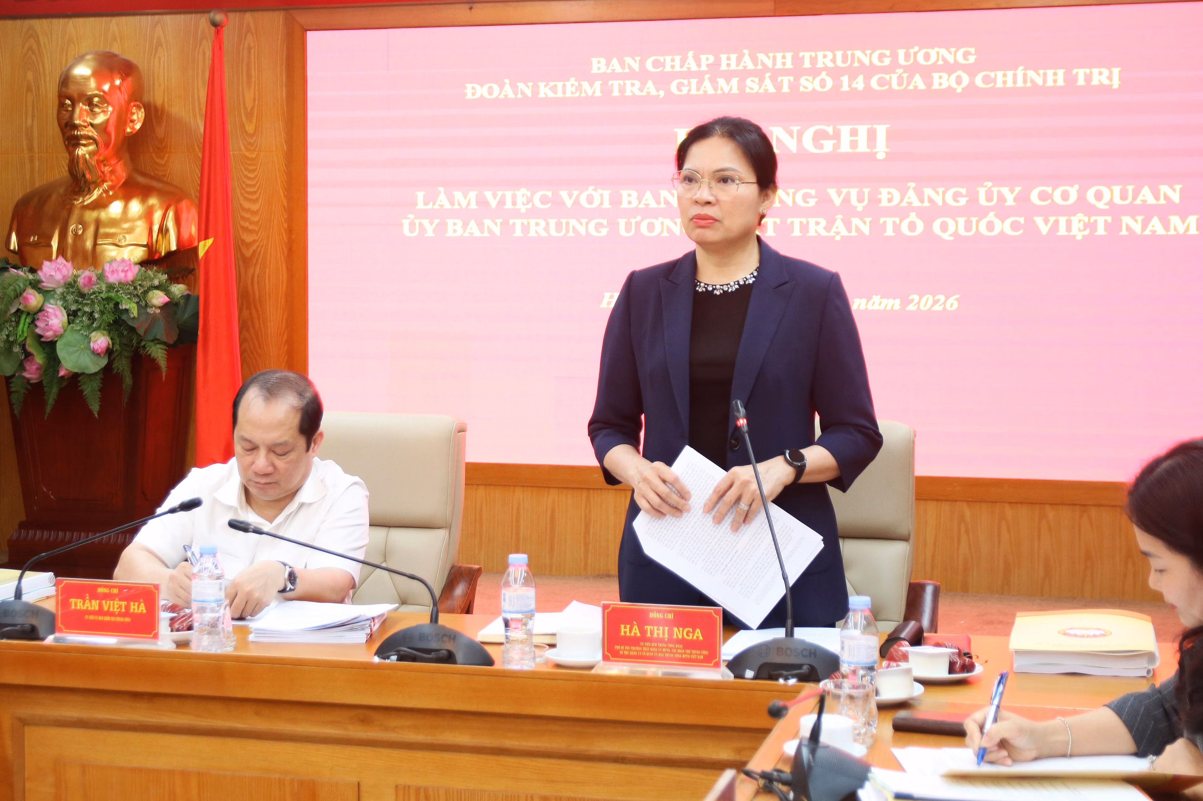 Trình bày báo cáo kết quả lãnh đạo, chỉ đạo, triển khai thực hiện các nội dung của đoàn kiểm tra nêu, Phó Bí thư Đảng ủy Cơ quan UBTƯ MTTQ Việt Nam Diệp Thị Thu Huyền cho biết, năm 2026, bám sát sự lãnh đạo, chỉ đạo của Ban Chấp hành Trung ương, Bộ Chính trị, Ban Bí thư, Đảng ủy MTTQ, các đoàn thể Trung ương, Đảng ủy Cơ quan UBTƯ MTTQ Việt Nam đã quan tâm lãnh đạo, chỉ đạo ban hành đồng bộ các văn bản định hướng, hướng dẫn tổ chức nghiên cứu, học tập, quán triệt và triển khai thực hiện Nghị quyết Đại hội XIV, công tác chuẩn bị bầu cử, tạo cơ sở chính trị và pháp lý quan trọng để các cấp ủy, tổ chức đảng và hệ thống Mặt trận triển khai thực hiện thống nhất, đồng bộ.