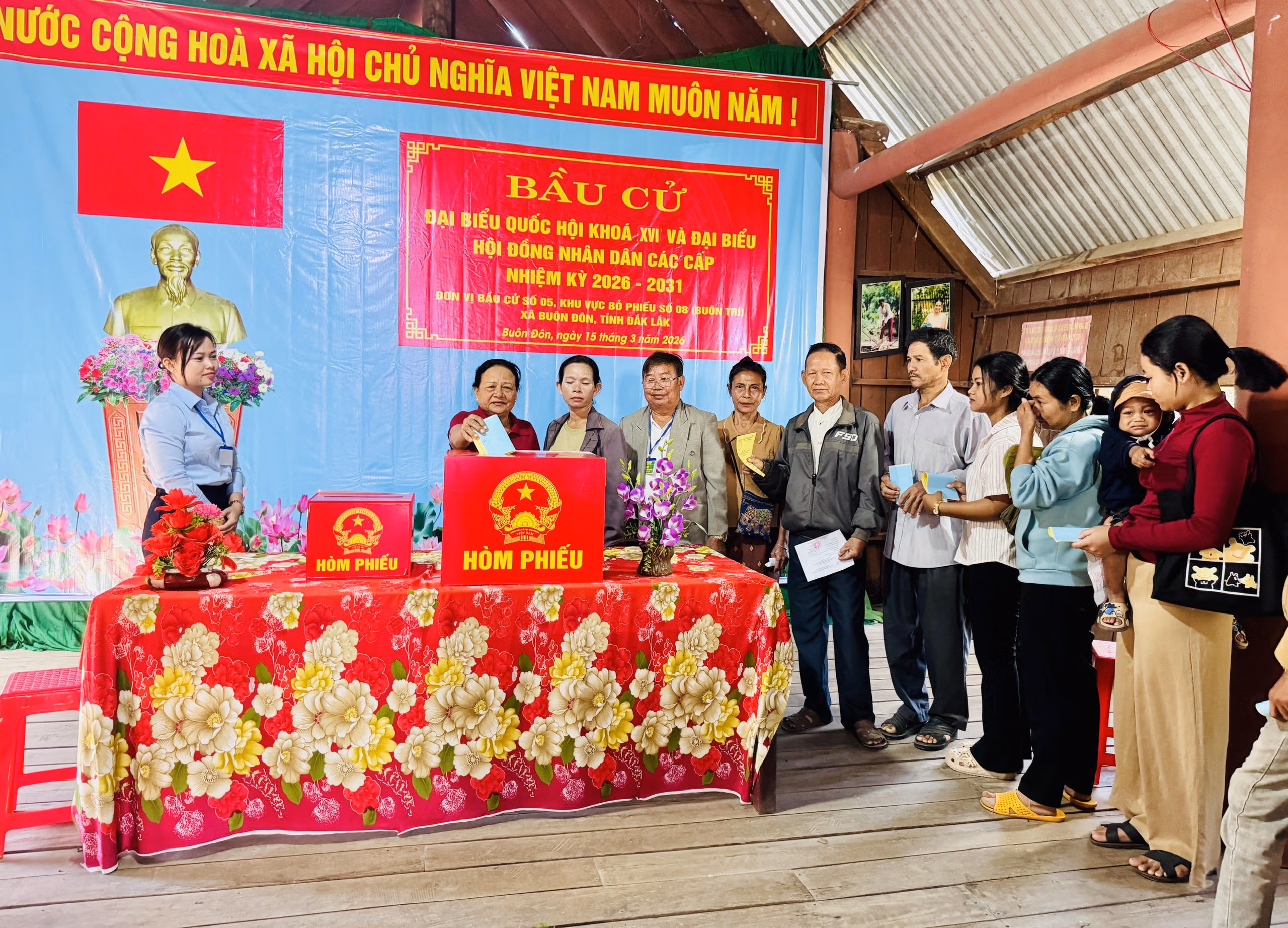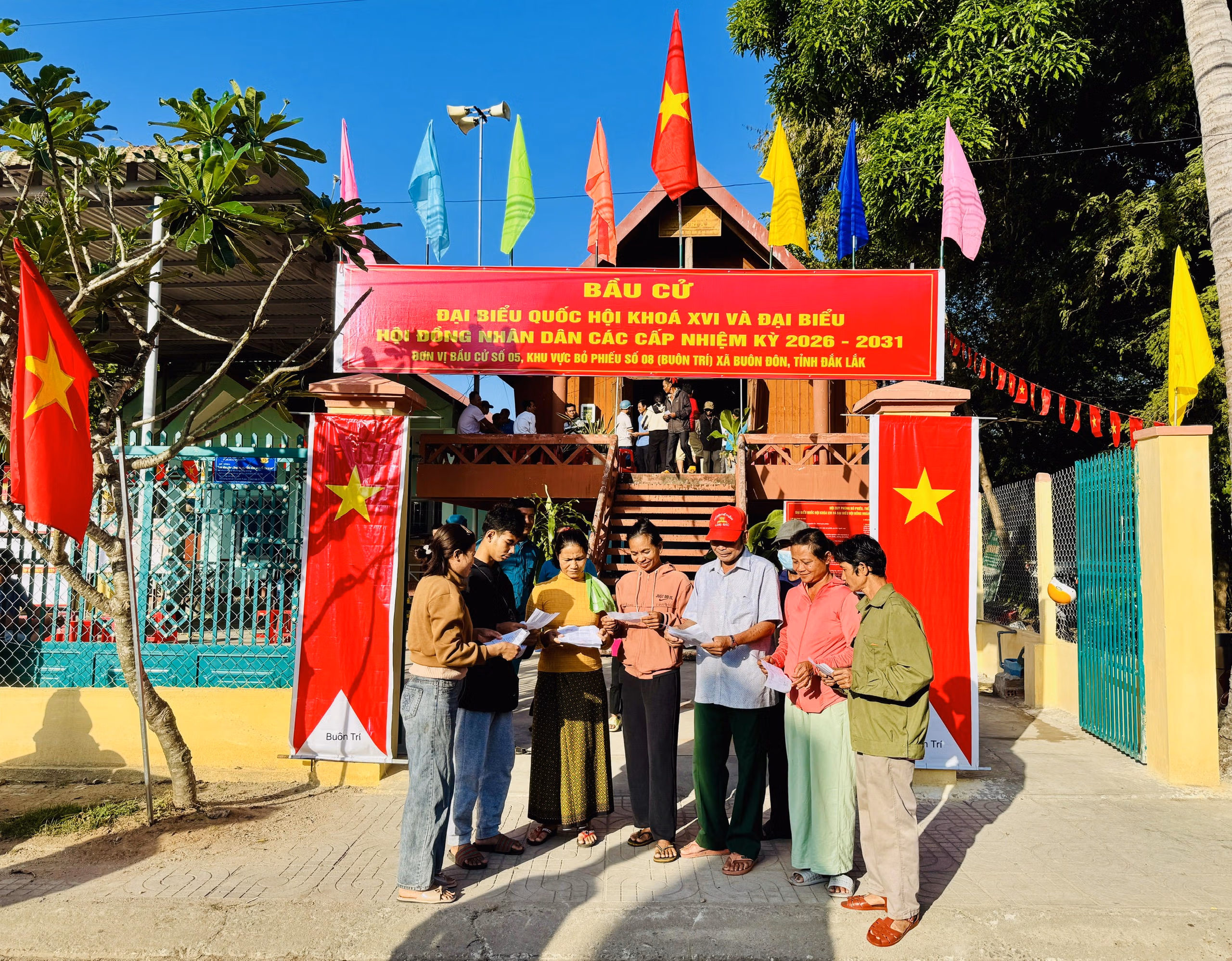 Sáng ngày bầu cử, khắp các buôn làng của xã Buôn Đôn rực rỡ sắc đỏ của cờ Tổ quốc. Những con đường đất đỏ dẫn vào các điểm bỏ phiếu được trang hoàng cờ hoa, băng rôn, khẩu hiệu. Từ sáng sớm, bà con đã nô nức đến các điểm bầu cử với trang phục truyền thống rực rỡ, gương mặt ai cũng ánh lên niềm vui và niềm tự hào.