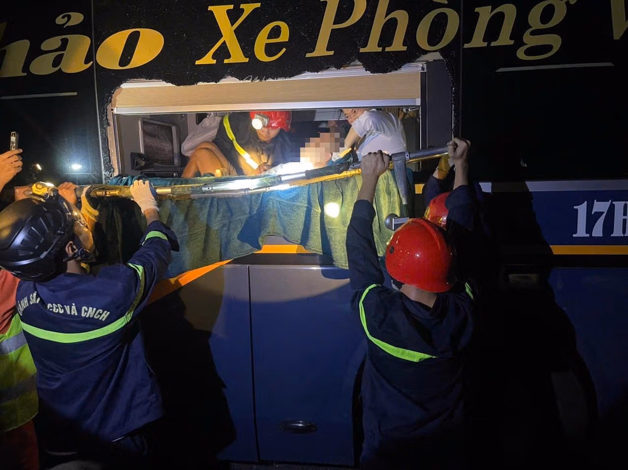Nhận tin báo, Phòng Cảnh sát PCCC và cứu nạn cứu hộ đã điều động 2 xe cứu hộ, chữa cháy, huy động tổ ứng cứu đến hiện trường. Lúc này, cửa xe khách cũng mắc kẹt, lực lượng cứu nạn đã phá cửa kính xe khách và đưa 11 người ra ngoài, đồng thời triển khai các biện pháp đề phòng cháy nổ do có lượng nhiên liệu chảy xuống dưới đường.