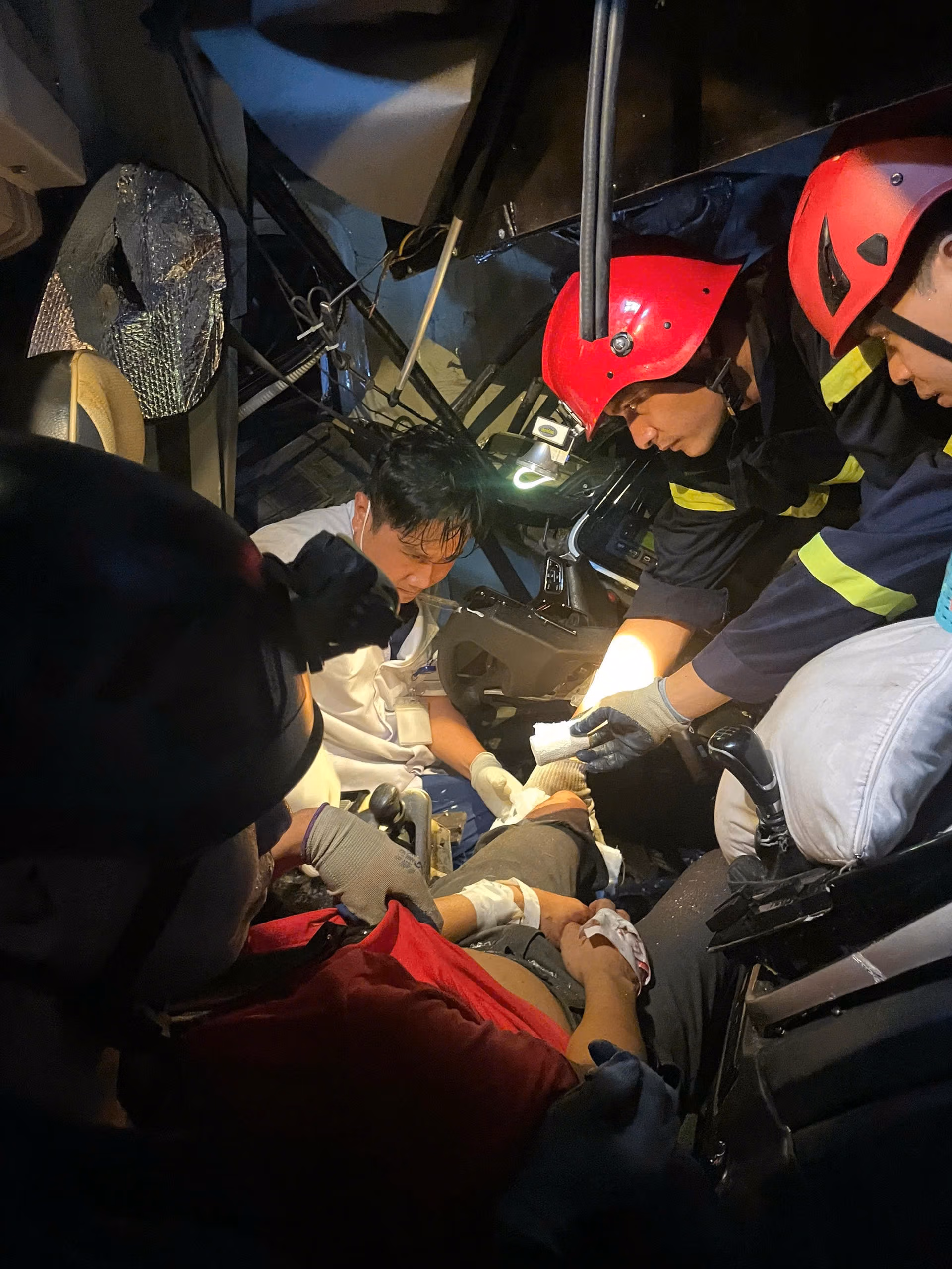 Riêng phần cabin xe khách bị tông biến dạng khiến tài xế bị mắc kẹt. Trong đêm, lực lượng cảnh sát đã đưa được tài xế ra ngoài và bàn giao cho lực lượng y tế.