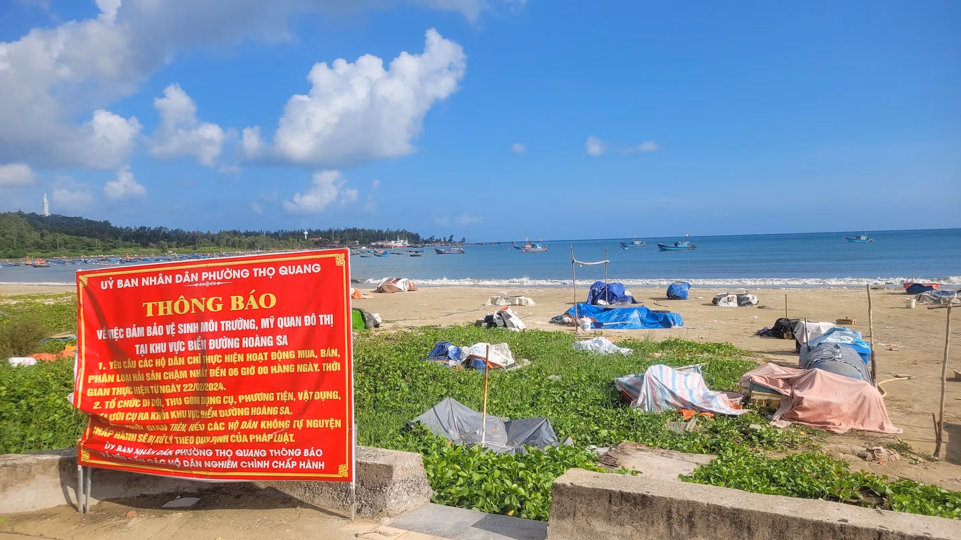 Để đảm bảo mỹ quan, cảnh quan, ngăn chặn ô nhiễm phục vụ du lịch, UBND phường Thọ Quang đã đặt bảng yêu cầu các hộ dân chỉ hoạt động mua bán, phân loại hải sản chậm nhất đến 6h sáng; di dời phương tiện, vật dụng, ngư lưới cụ ra khỏi khu vực biển Hoàng Sa.