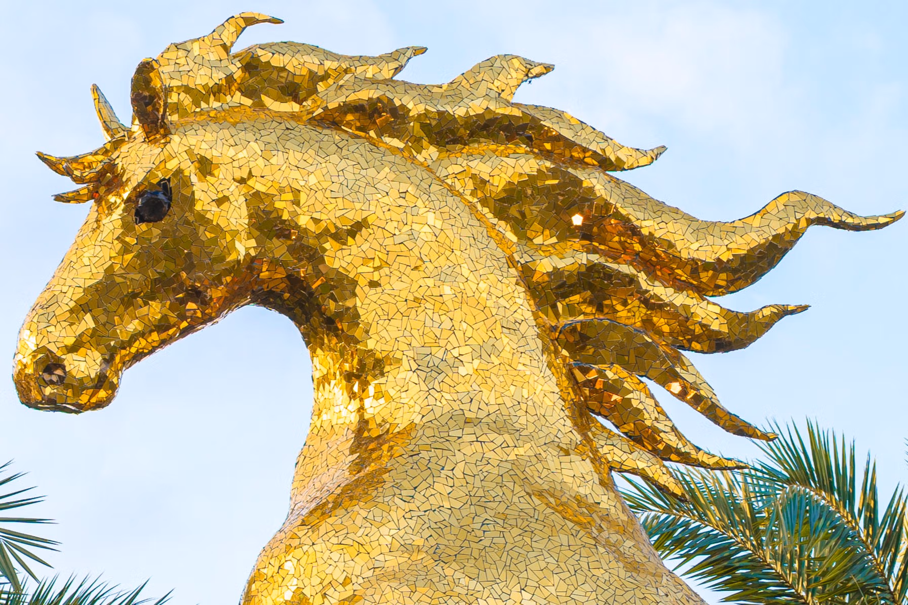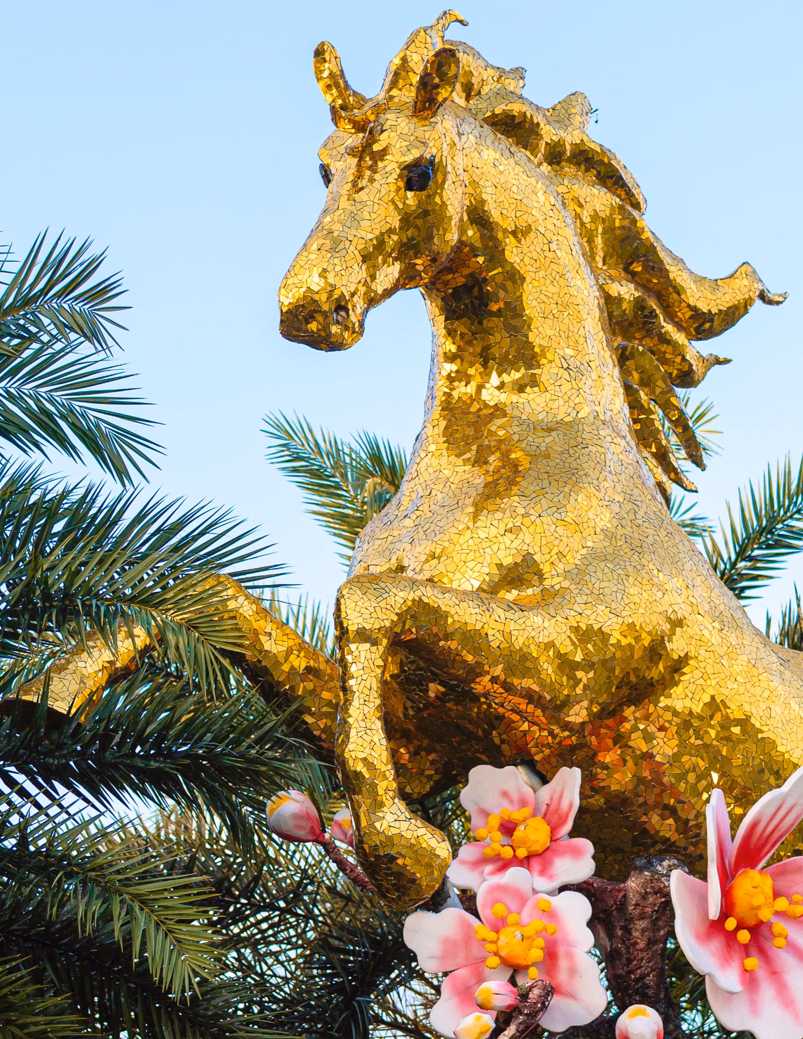 Tác phẩm Ngựa Vàng cao 5m được đội ngũ nghệ nhân Đinh Văn Tâm miệt mài thi công trong hơn một tháng, với khung khung sắt kiên cố chịu lực, bao phủ hơn 60m² ALU màu vàng rực rỡ.