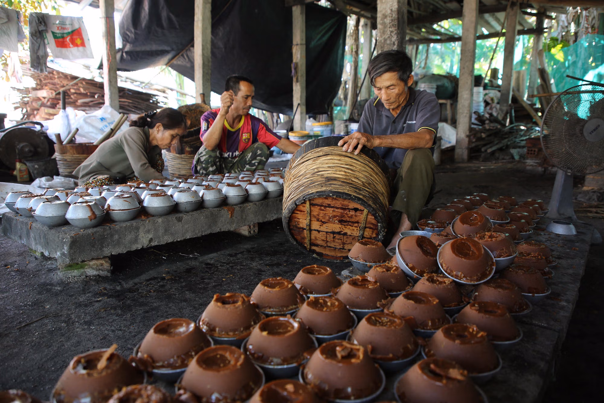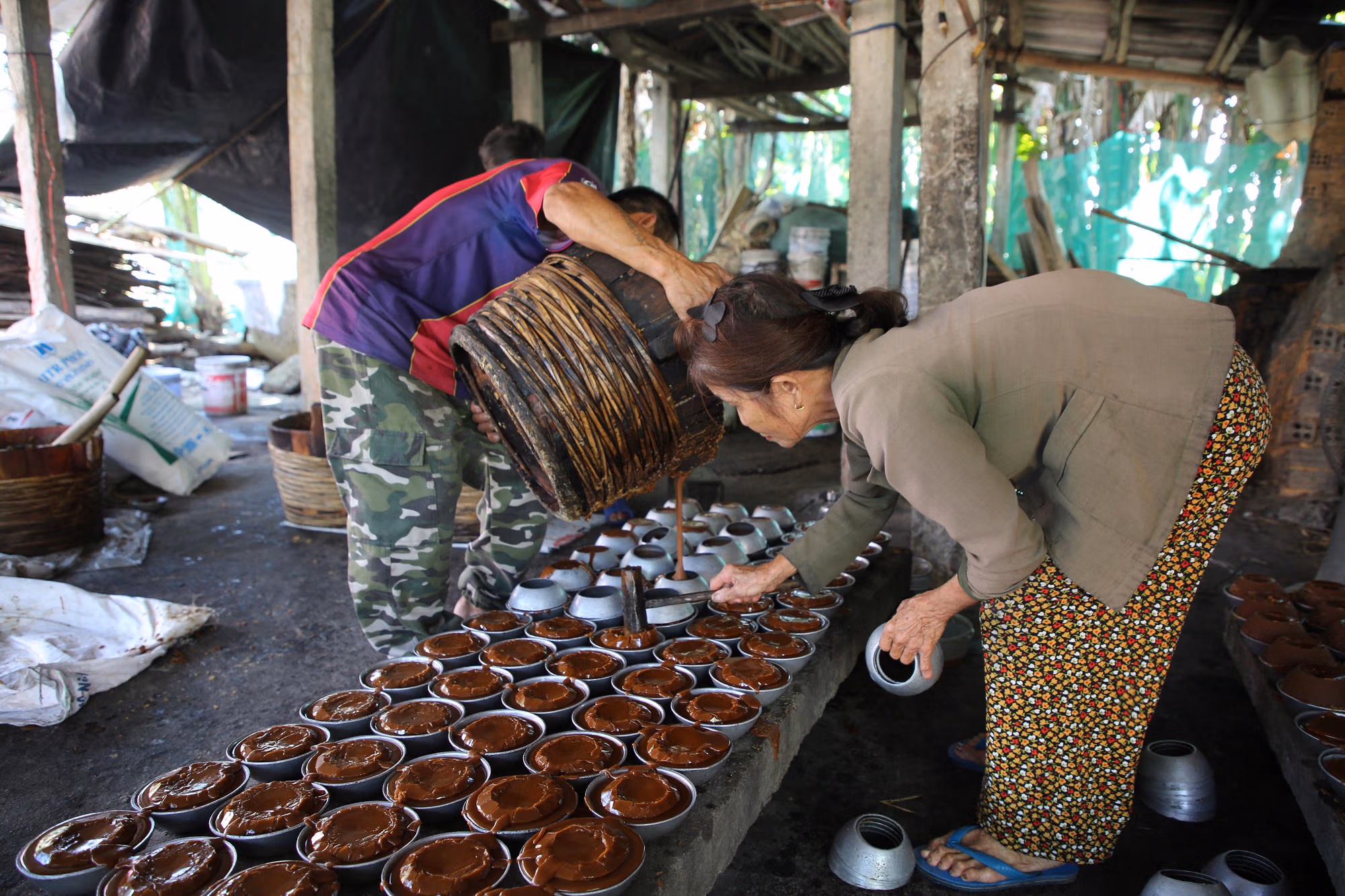Đứng bên nồi gang sôi sùng sục, nhiệt độ tỏa ra hầm hập, ông Nhân phải liên tục khuấy đều tay. Ánh mắt ông không rời mặt nước mía đang chuyển dần từ màu vàng nhạt sang nâu đậm. Chỉ cần lỡ tay một chút, đường sẽ bị cháy hoặc không đủ độ kết dính.