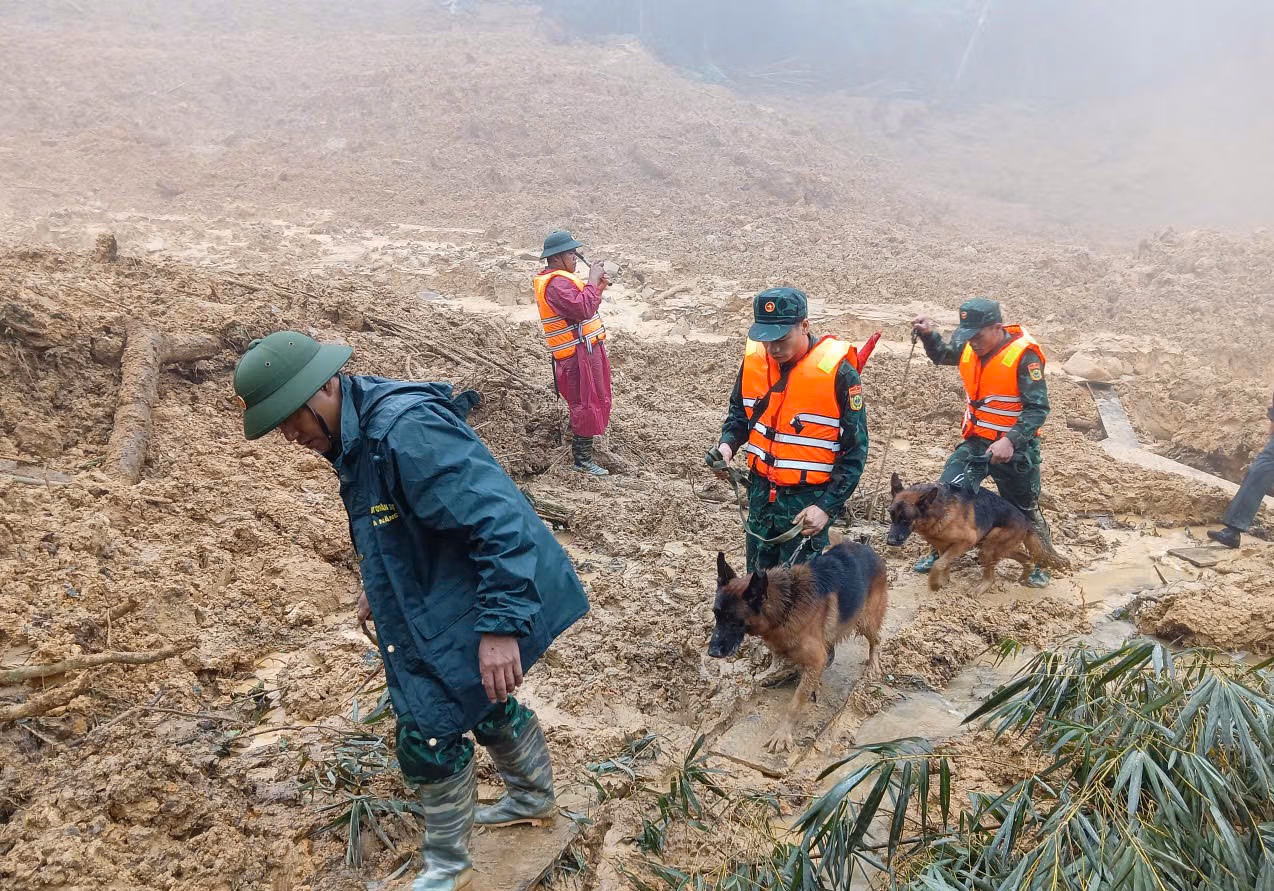 Ba chó nghiệp vụ được huy động để hỗ trợ khoanh vùng các vị trí nghi vấn dưới lớp đất đá dày. Các lực lượng chia thành nhiều tổ, rà soát các khe suối, chân taluy và những điểm bị vùi lấp.