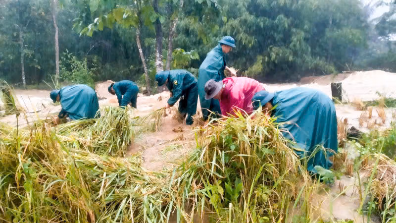 Tại thôn Đắc Rích, các lực lượng vũ trang đóng chân trên địa bàn cùng chính quyền và dân quân địa phương hỗ trợ hai hộ gia đình Alăng Vâl và Alăng Dứm gặt hơn 800m² lúa đang bị ngập sâu, có nguy cơ đổ ngã.