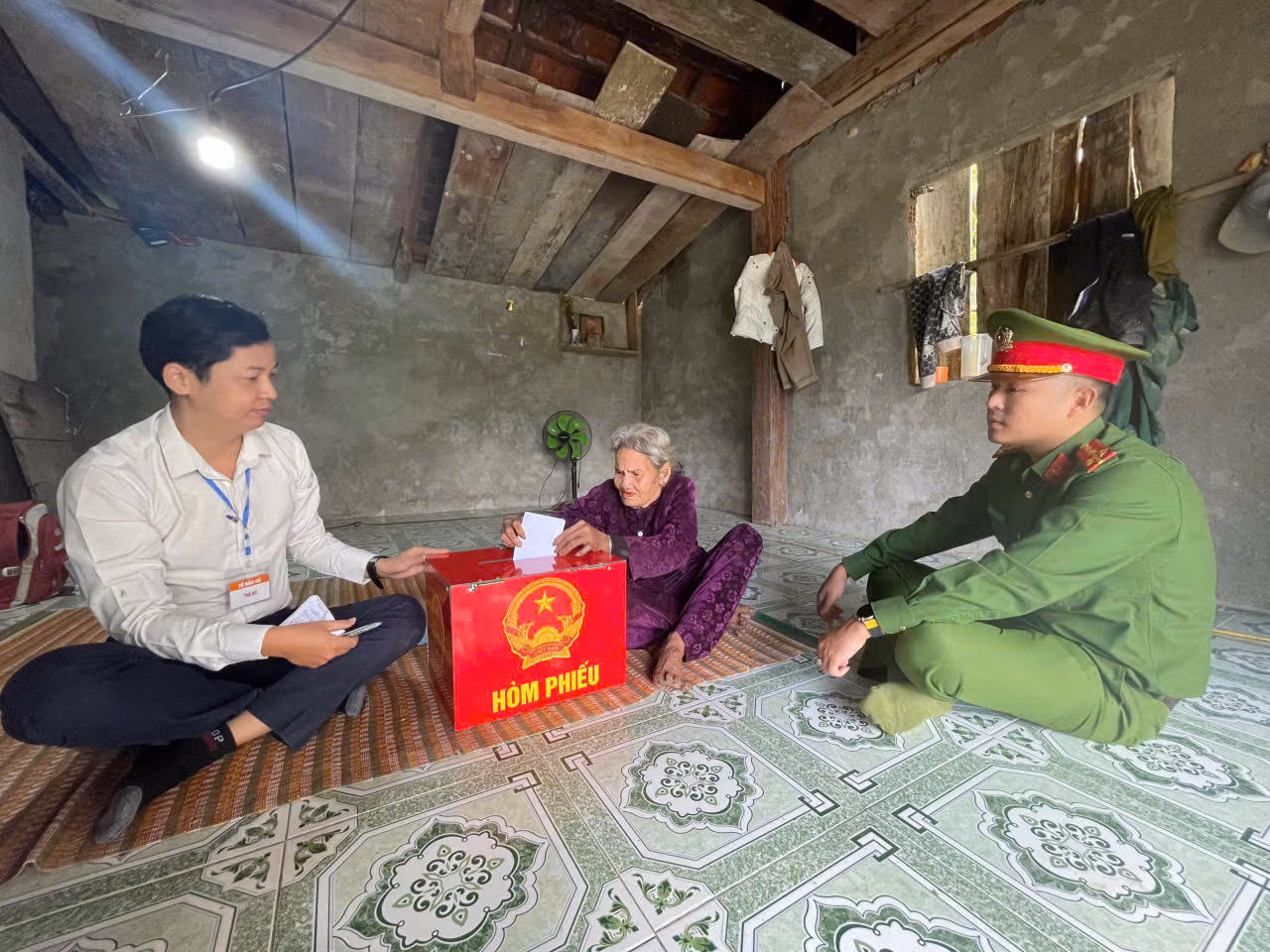 Tại thôn 4, xã Sơn Cẩm Hà, Tổ bầu cử cũng mang thùng phiếu phụ đến nhà bà Dũ Thị Hà (87 tuổi) để bà thực hiện quyền công dân. Do sức khỏe yếu, bà Hà đang bị đau ốm và không thể đến khu vực bỏ phiếu. Khi các thành viên Tổ bầu cử đến nhà, bà Hà được hướng dẫn kiểm tra danh sách, nhận phiếu và bỏ phiếu đúng quy định. Dù đang đau ốm, bà vẫn cố gắng tự tay bỏ lá phiếu của mình và bày tỏ sự xúc động khi vẫn được tham gia ngày hội bầu cử của toàn dân.