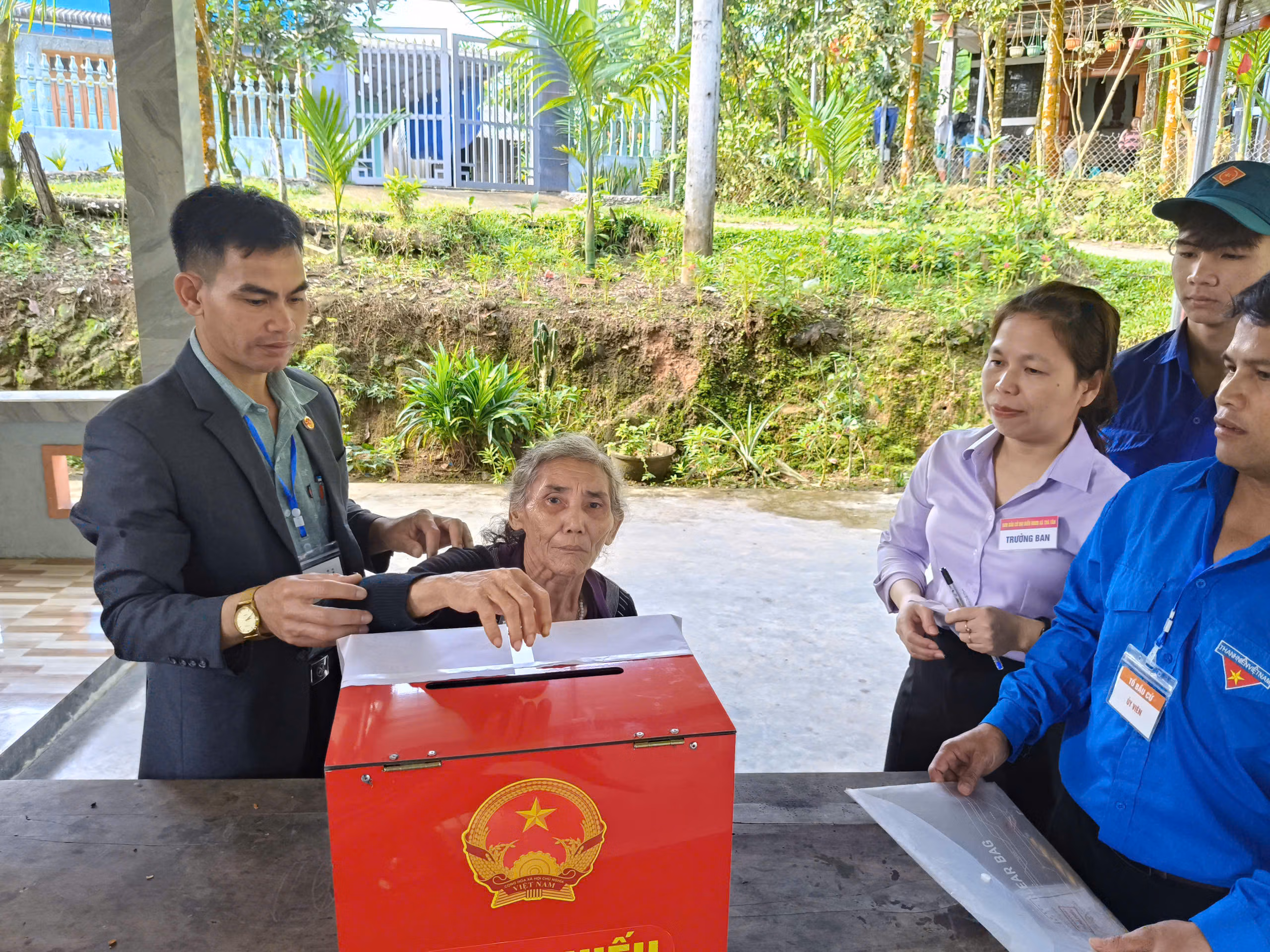 Không chỉ tại Sơn Cẩm Hà, ở những nóc xa của thôn Sông Y, xã Trà Tân, TP Đà Nẵng, nơi đường sá đi lại còn nhiều khó khăn, các tổ bầu cử cũng chủ động mang thùng phiếu phụ đến từng hộ gia đình.
