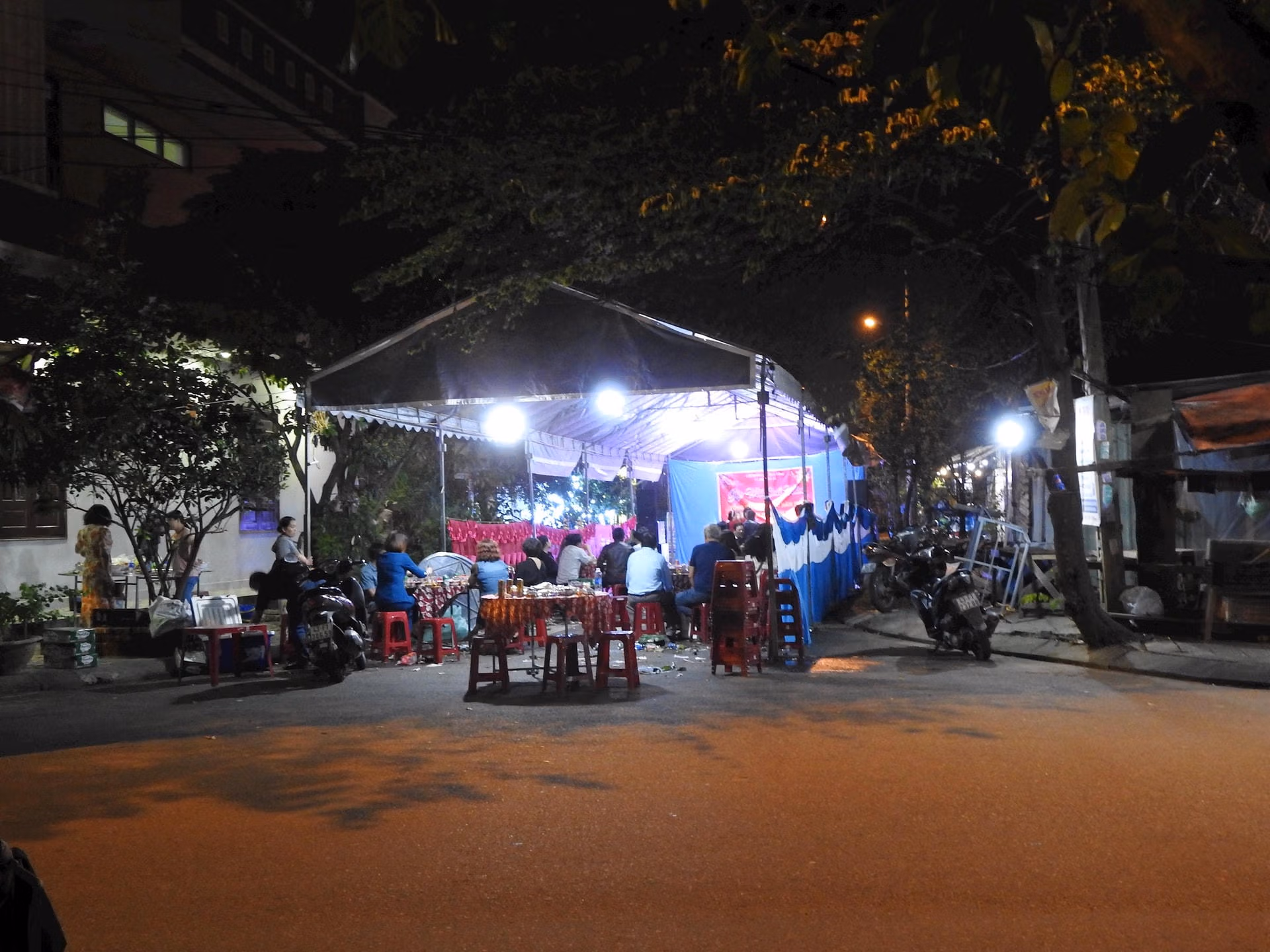 “Khán đài” bên trong lều bạt chiếm hết lòng đường Hòa Phú 19 có dòng chữ “UBND phường Hòa Minh, Tổ dân phố 26, gặp mặt cuối năm, tổng kết công tác năm 2023, triển khai nhiệm vụ năm 2024”.