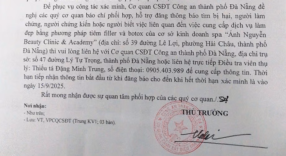 Do đó, cơ quan điều tra phát thông báo tìm kiếm các nạn nhân khác, người làm chứng, người chứng kiến hoặc người biết việc liên quan đến việc cung cấp dịch vụ làm đẹp bằng phương pháp tiêm filler và botox của cơ sở kinh doanh spa "Anh Nguyễn Beauty Clinic & Academy” (số 39 đường Lê Lợi), khẩn trương liên hệ Cơ quan Cảnh sát điều tra Công an TP Đà Nẵng (47 đường Lý Tự Trọng, phường Hải Châu) hoặc qua điều tra viên thụ lý – Thiếu tá Đặng Minh Trung, điện thoại 0905.403.989 để cung cấp thông tin.