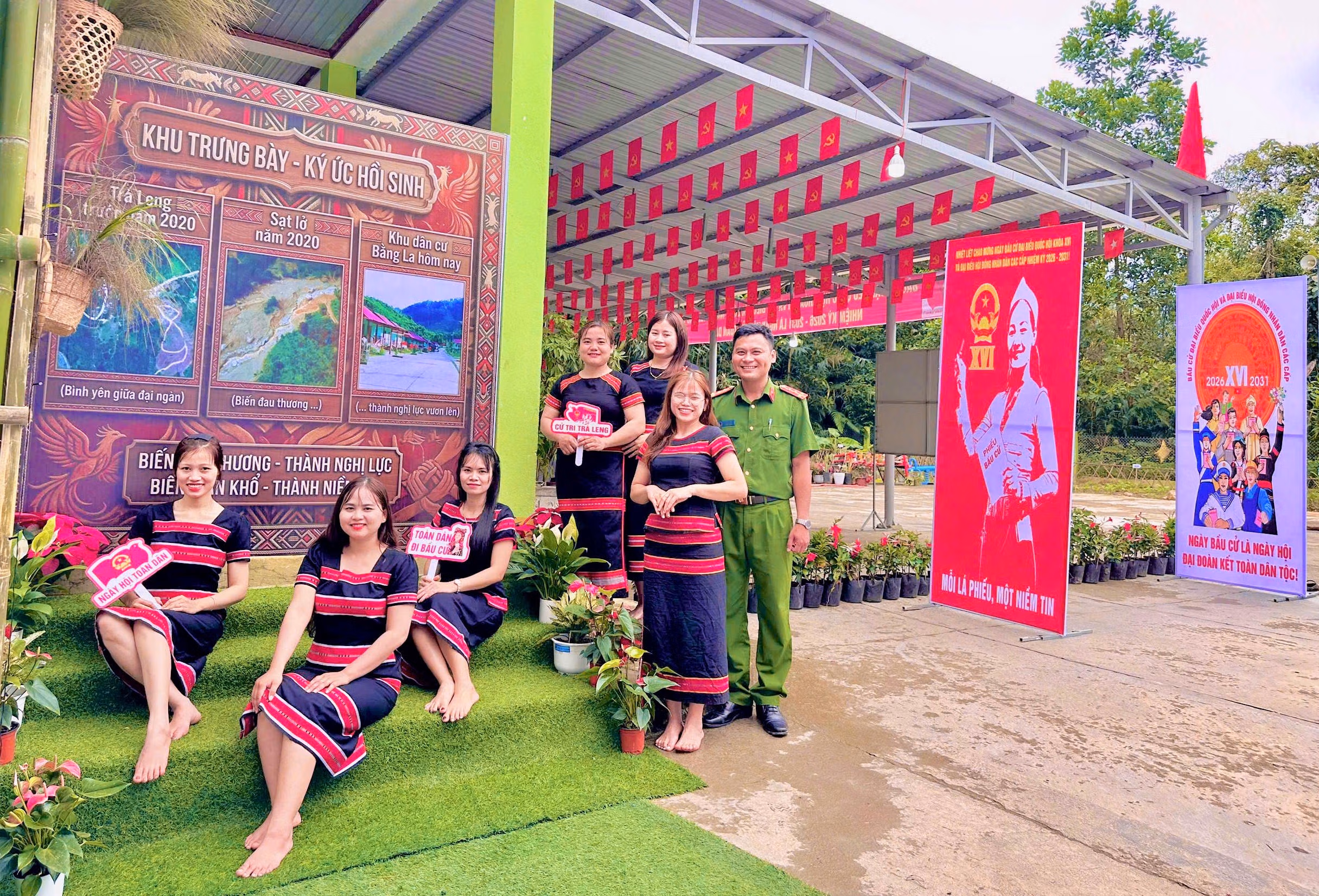 Tại khu vực bỏ phiếu số 8, nóc Ông Đề, xã Trà Leng, cán bộ và người dân không chỉ dựng cổng chào bằng tre, nứa mà còn trưng bày các nhạc cụ, nông cụ, sản phẩm thủ công mỹ nghệ, đan lát đặc trưng của địa phương. Cạnh đó, nhiều hình ảnh cũng được trưng bày nhằm tái hiện sự hồi sinh mạnh mẽ của Trà Leng sau vụ sạt lở núi lịch sử năm 2020.