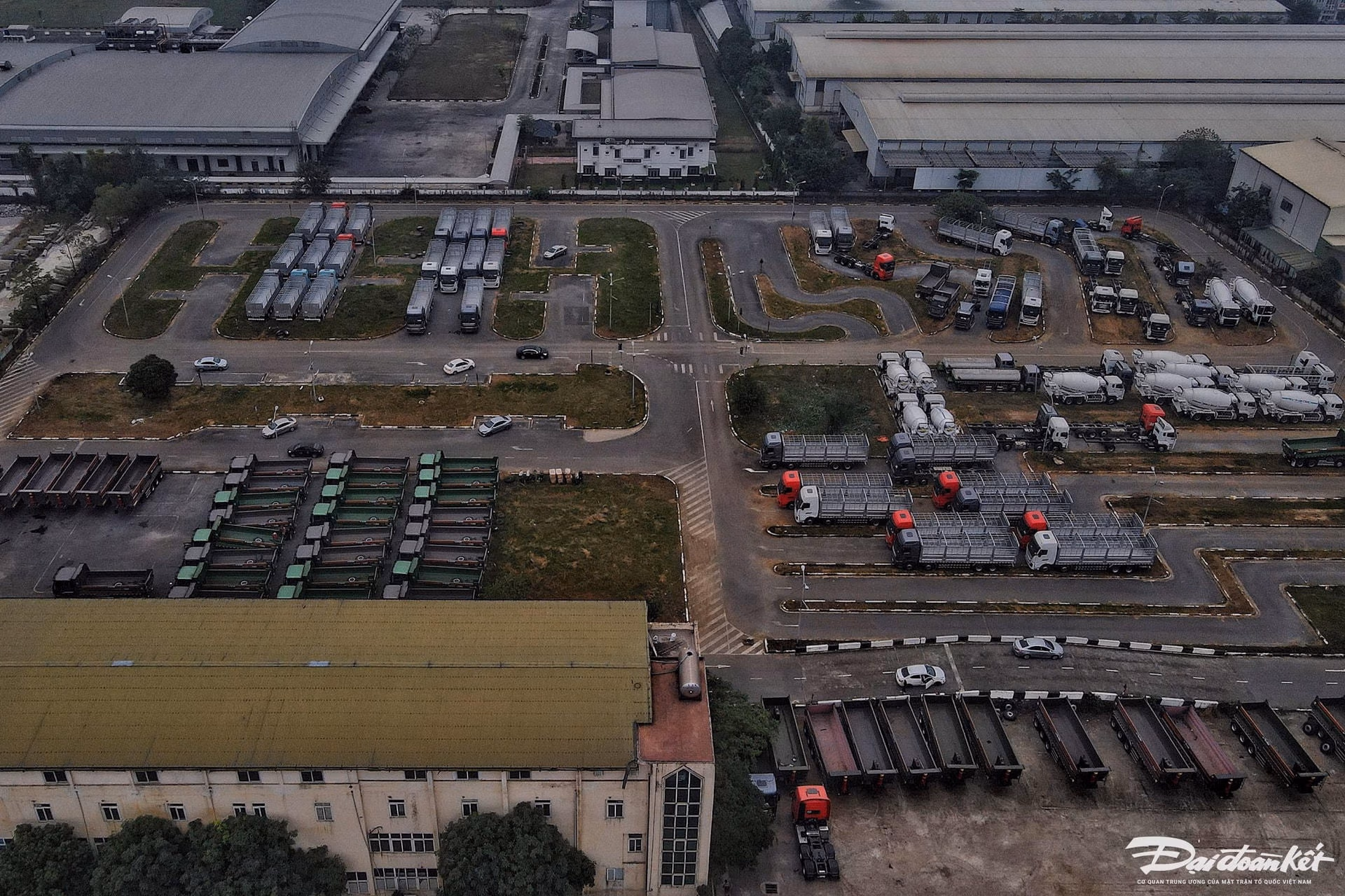 Trên sân tập lái của Đại học Đông Đô được tập kết hơn 100 chiếc xe tải cỡ lớn, xe bồn chở bê tông, xe đầu kéo… Những chiếc xe được xếp ngang dọc trên phần sân tập, vỉa hè từ cổng vào tới tận cuối sân.