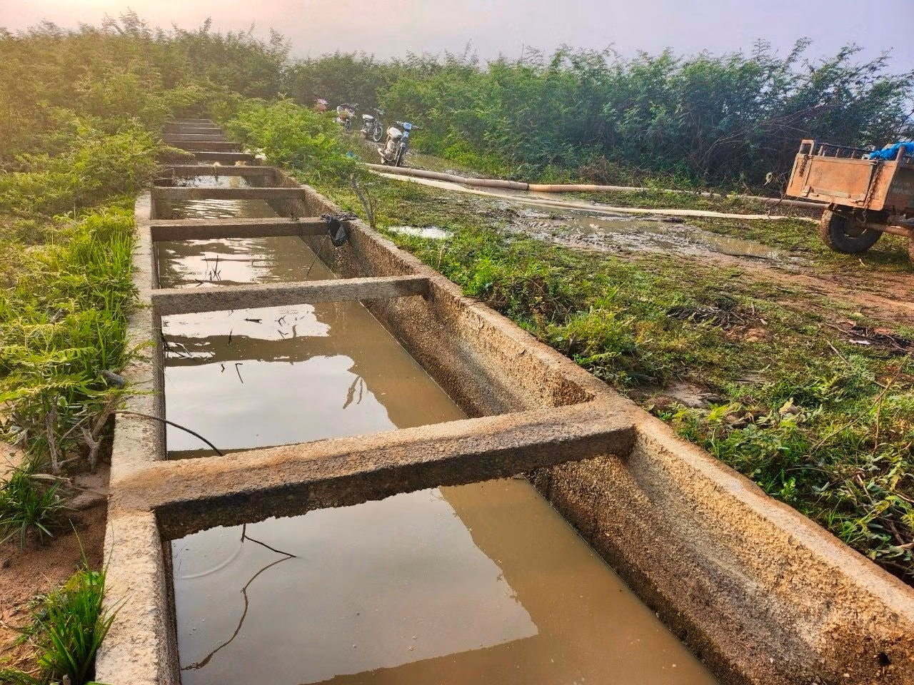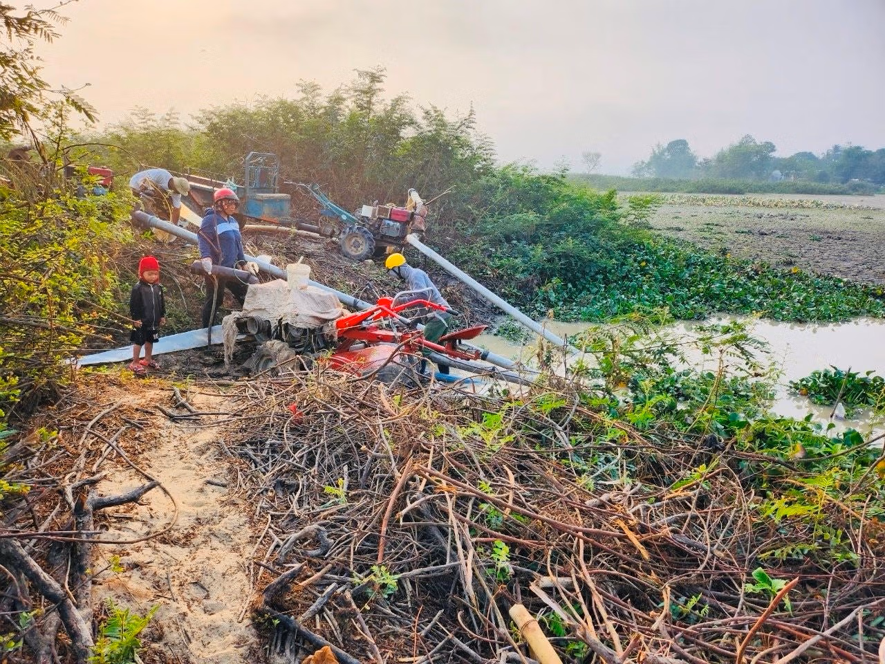 Lúc này mặt trời đã đứng bóng, dưới cái nắng gay gắt của mùa khô như cháy da, cháy thịt; đi sâu vào trong cánh đồng, cảnh tượng đầu tiên đập vào mắt chúng tôi đó là cả chục máy bơm nước đang đặt ở các sình để bơm nước cứu lúa. Người thì nối đường ống, người thì đặt máy bơm, chỗ nào có nước là bà con tận dụng hết để cứu lúa. Nhiều chân ruộng đã xuống giống gieo trồng nhưng vì thiếu nước nên đất nứt nẻ, lúa cháy khô.