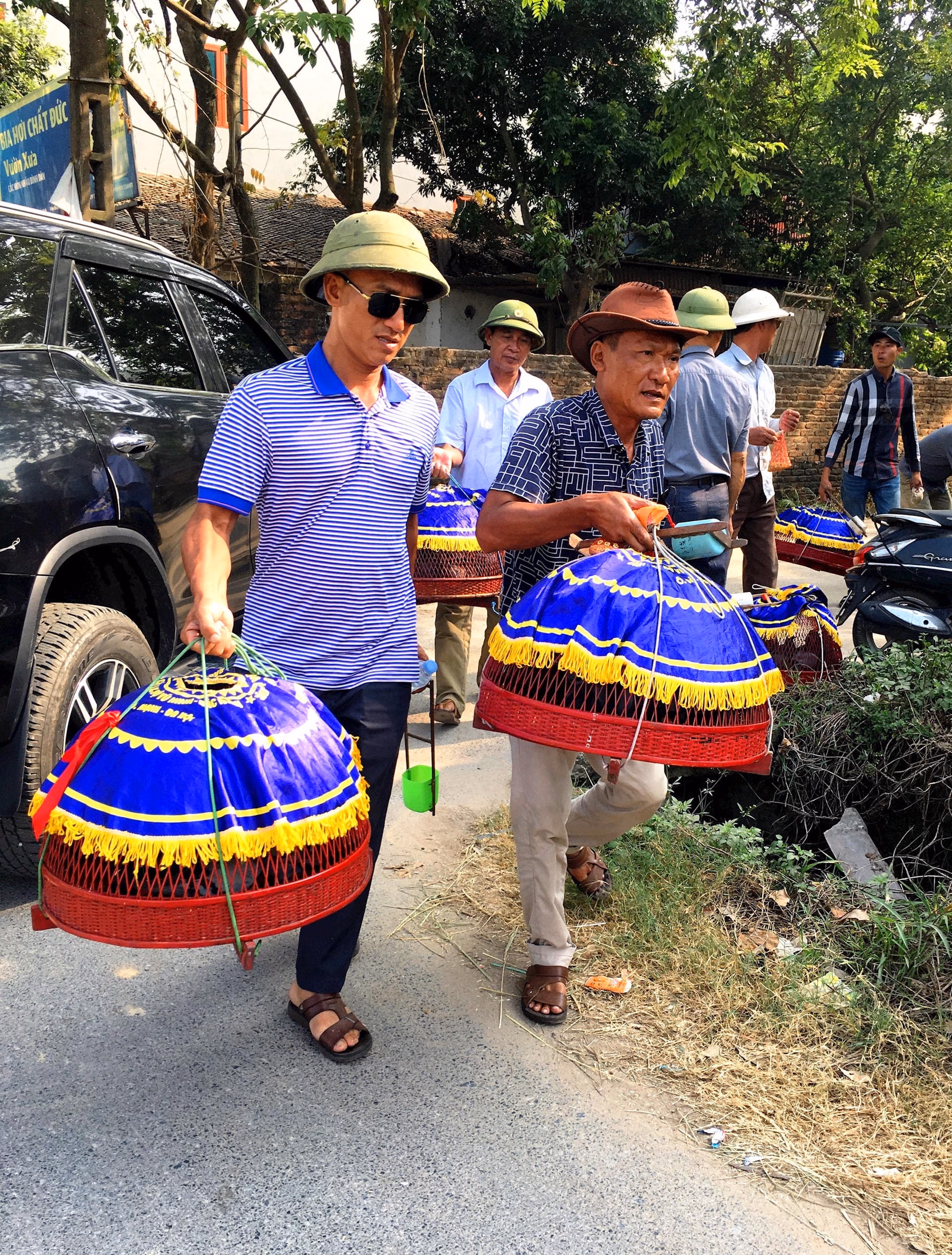 Những người tham gia cuộc thi thả chim bồ câu trong hội làng Yên Vĩ.
