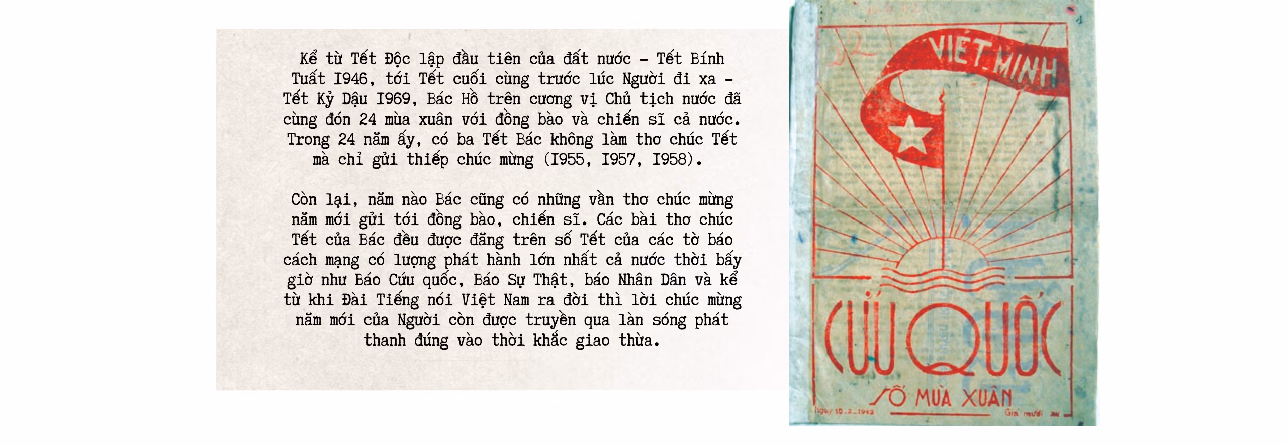 Kể từ Tết Ðộc lập đầu tiên của đất nước - Tết Bính Tuất 1946, tới Tết cuối cùng trước lúc Người đi xa - Tết Kỷ Dậu 1969, Bác Hồ trên cương vị Chủ tịch nước đã cùng đón 24 mùa xuân với đồng bào và chiến sĩ cả nước. Trong 24 năm ấy, có ba Tết Bác không làm thơ chúc Tết mà chỉ gửi thiếp chúc mừng (1955, 1957, 1958).