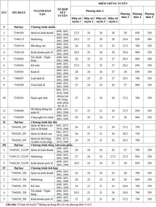 Trong đó, bốn nhóm được xét theo PT2. Nhóm 1 là học sinh đạt học lực loại giỏi với điểm chuẩn 24 đến 28,5/30 điểm, dẫn đầu là ngành Kinh doanh quốc tế và Marketing. Nhóm 2 là học sinh các trường chuyên, có điểm trung bình mỗi môn trong tổ hợp từ 7 trở lên, trường lấy mức 21-27 điểm.