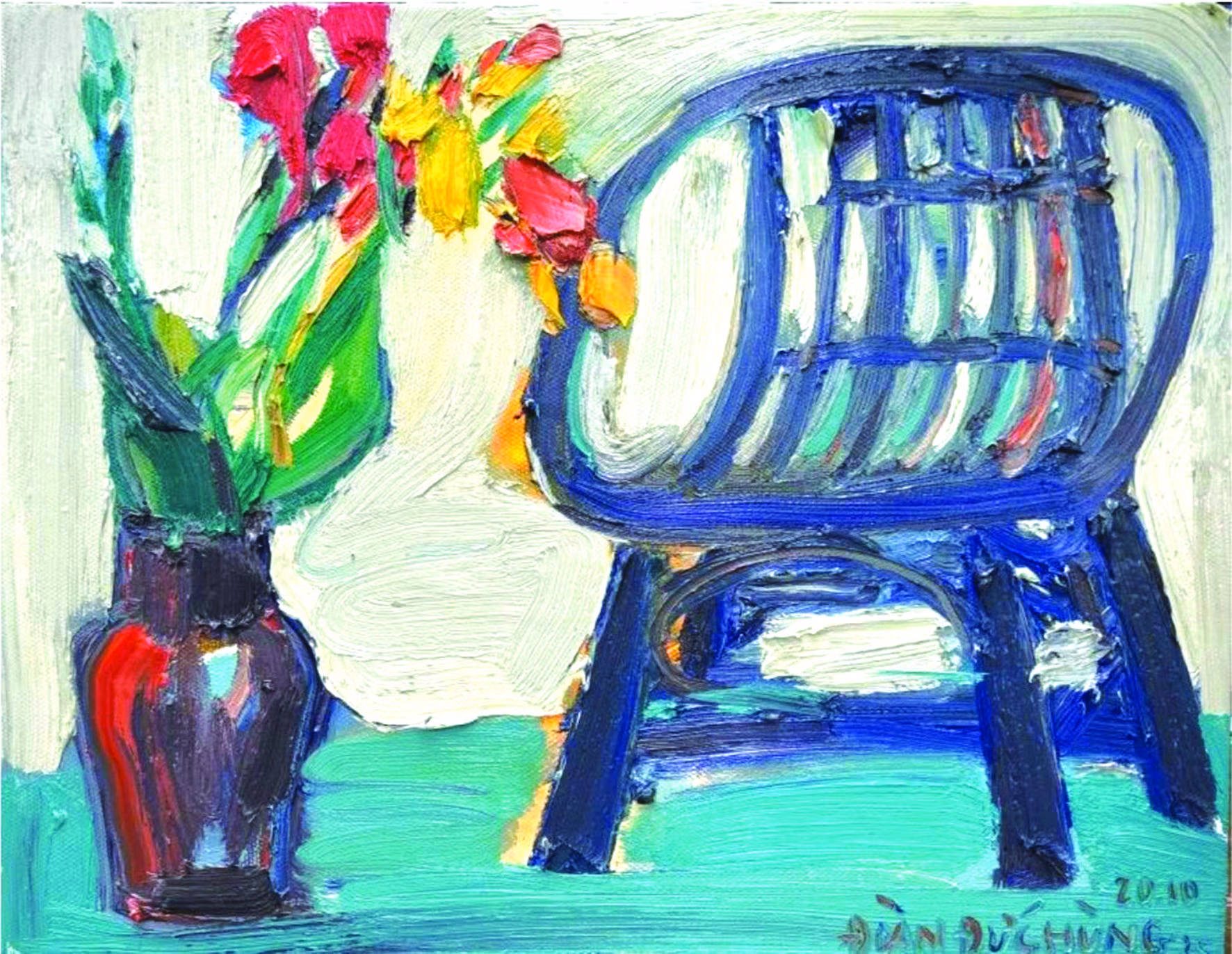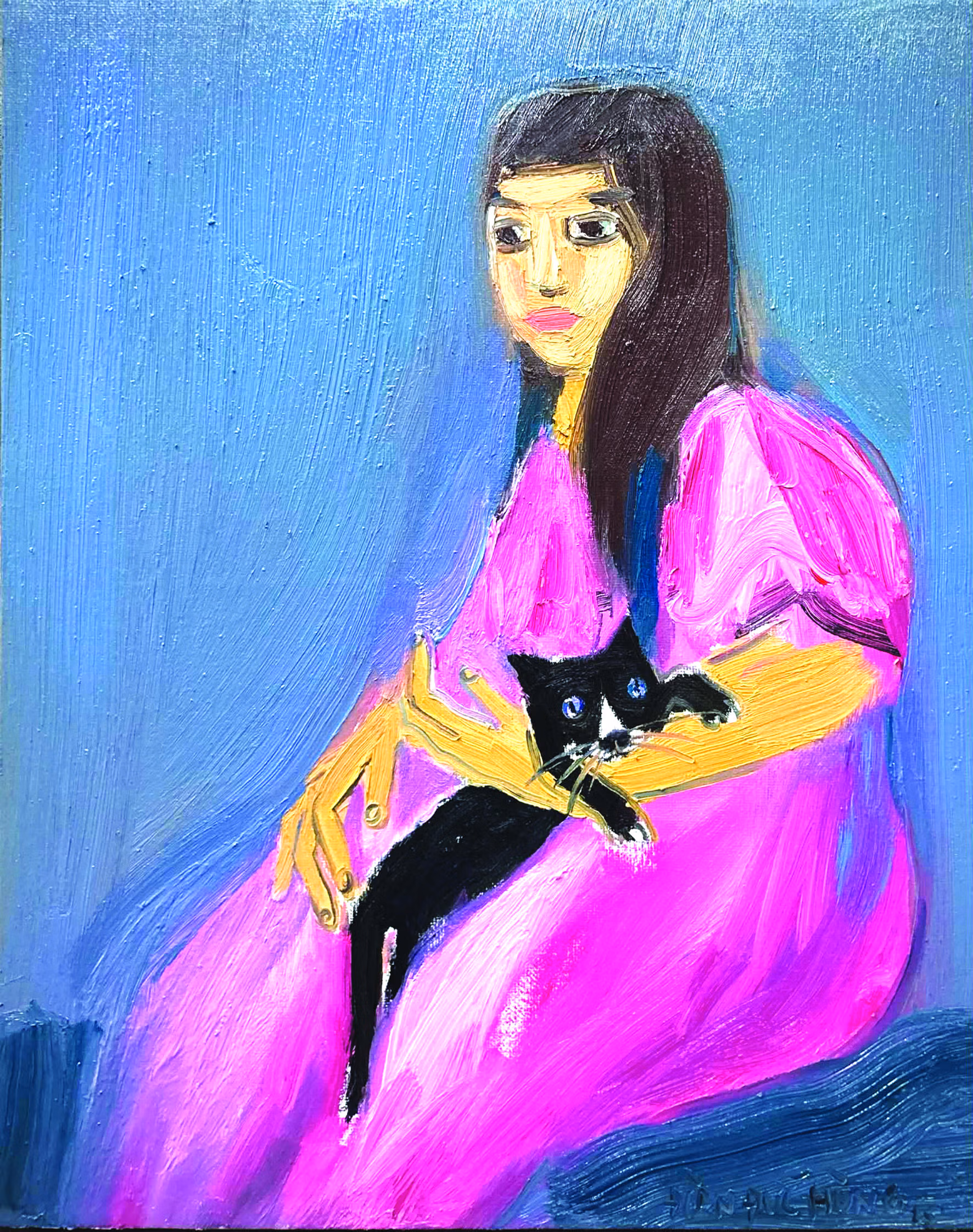 Màu sắc trong tranh Hùng là một thế giới riêng. Có những bức rực rỡ. Có những bức trầm, nâu đất, xám, xanh lam, gợi cảm giác sâu lắng, thậm chí u uẩn. Nhưng dù ở gam nào, màu của Hùng ẩn chứa một sức nén nội tâm. Nó không nhằm trang trí, không nhằm làm đẹp bề mặt, mà để đẩy cảm xúc lên một ngưỡng cần thiết. Ở ranh giới đó, người xem hoặc bị cuốn vào, hoặc bị buộc phải dừng lại và đối diện.