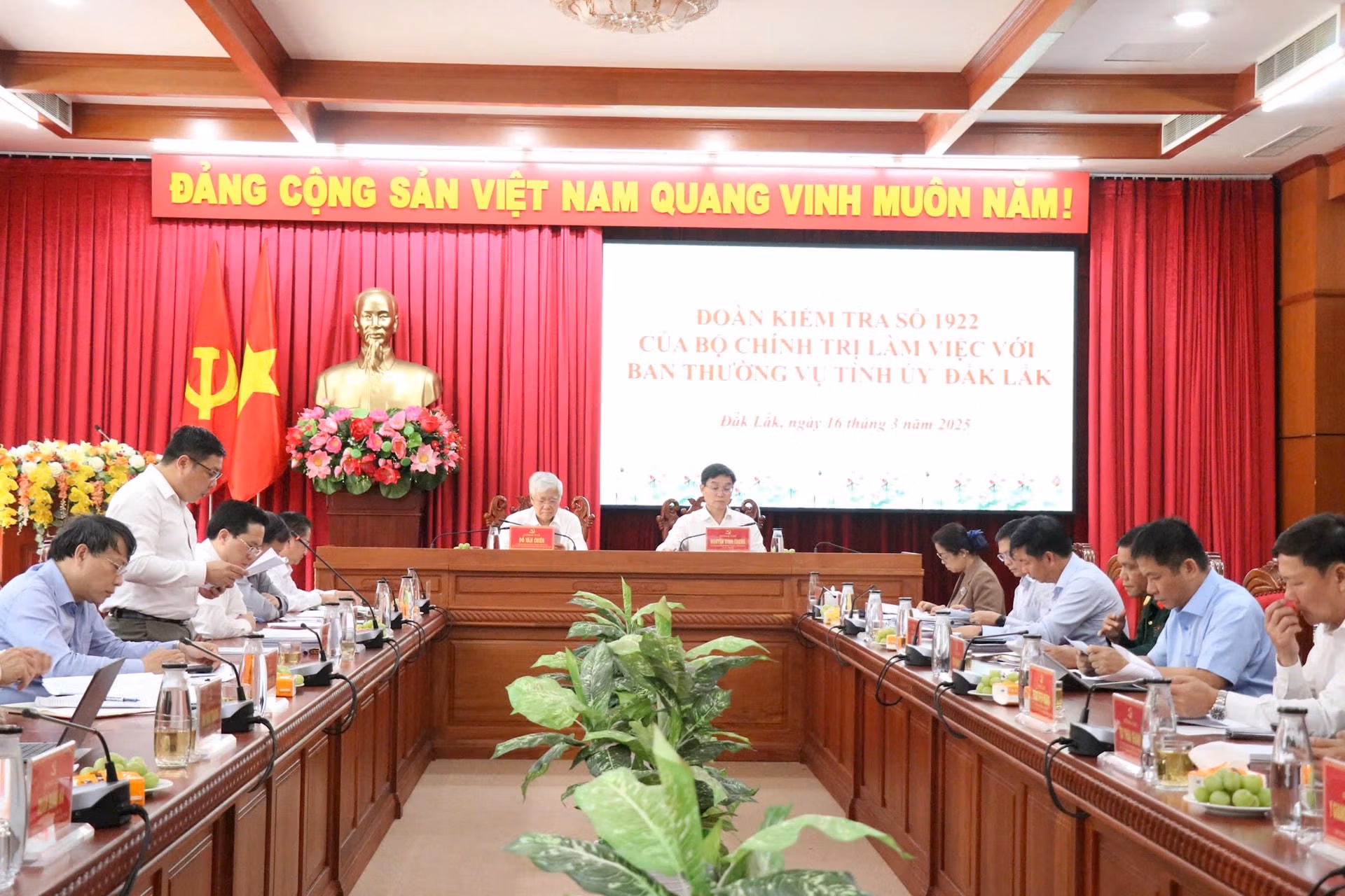 Chiều ngày 16/3, Đoàn kiểm tra số 1922 của Bộ Chính trị do ông Đỗ Văn Chiến, Ủy viên Bộ Chính trị, Bí thư Trung ương Đảng, Chủ tịch Ủy ban Trung ương Mặt trận Tổ Quốc Việt Nam làm trưởng đoàn đã làm việc với Ban Thường vụ Tỉnh ủy Đắk Lắk.