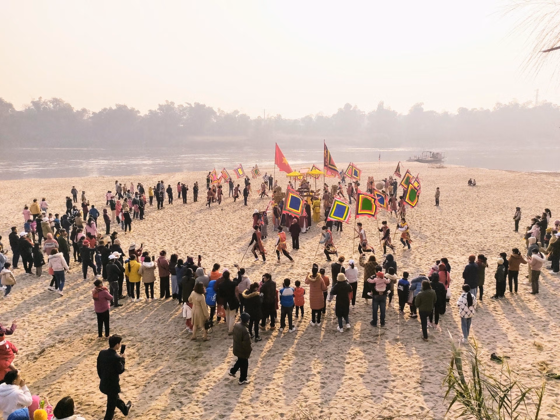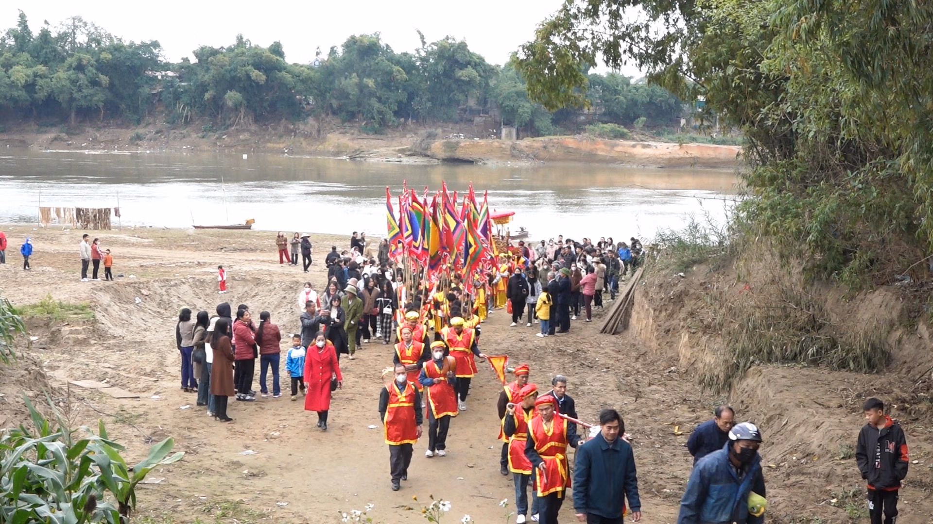 Trong tiếng nhạc bát ấm, đoàn lễ đi đầu là cờ, quạt rồi tới phường bát âm, tiếp đến là kiệu long đình trên đặt chiếc chóe (chiếc bình gốm sứ men lam vẽ rồng - phượng để đựng nước Thánh), hai bên có lọng che. Khi đội rước gần đến bến sông sẽ dừng lại cho đội cờ chạy quanh ba vòng, vừa chạy vừa hú to để diễn lại tích quân của Hai Bà Trưng đánh đuổi quân Tô Định.