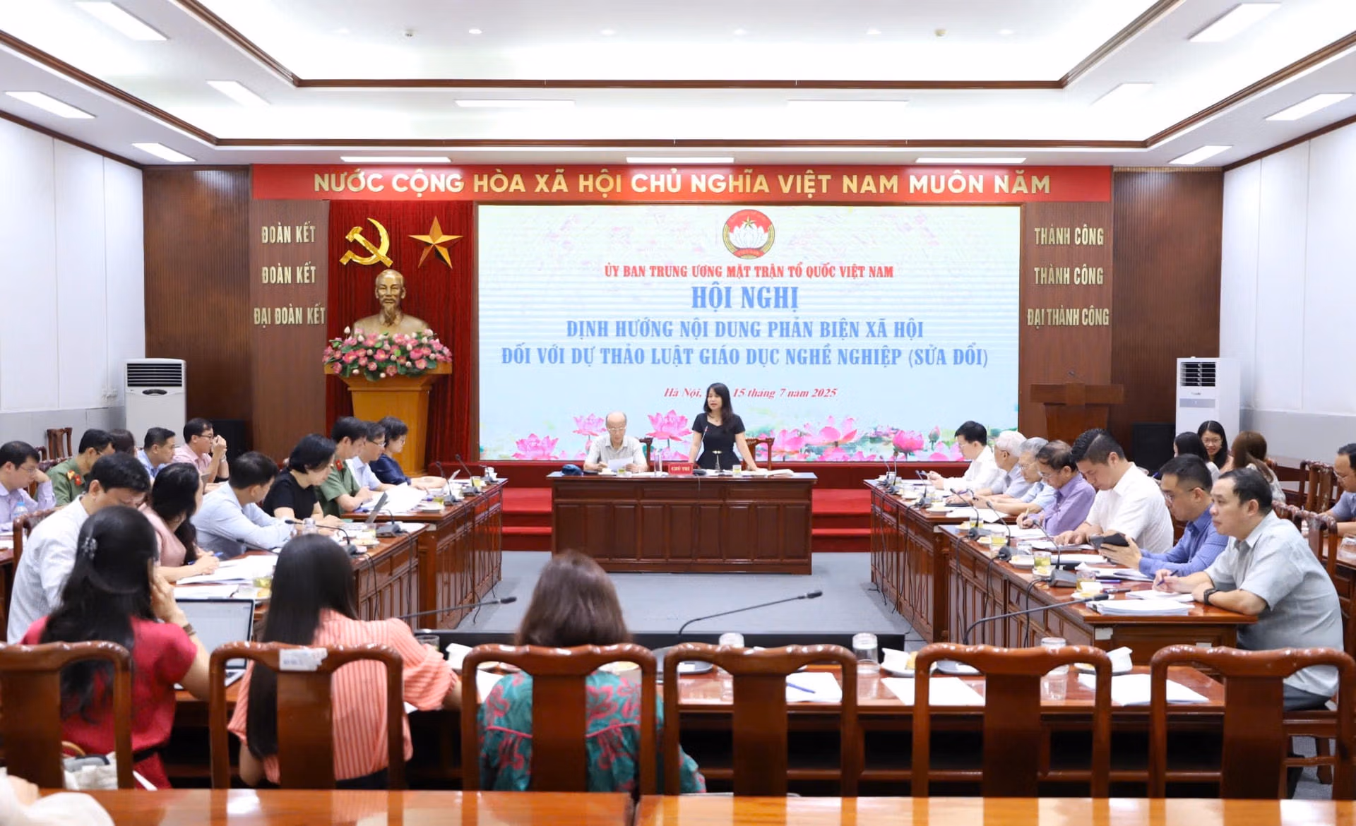 Ngày 15/7, UBTƯ MTTQ Việt Nam tổ chức hội nghị định hướng nội dung phản biện xã hội đối với dự thảo Luật Giáo dục nghề nghiệp (GDNN) sửa đổi. TS Nguyễn Quỳnh Liên, Ủy viên Đoàn Chủ tịch, Ban Dân chủ, Giám sát và phản biện xã hội; GS.TS Trần Ngọc Đường, Chủ nhiệm Hội đồng Tư vấn Dân chủ và pháp luật chủ trì hội nghị.