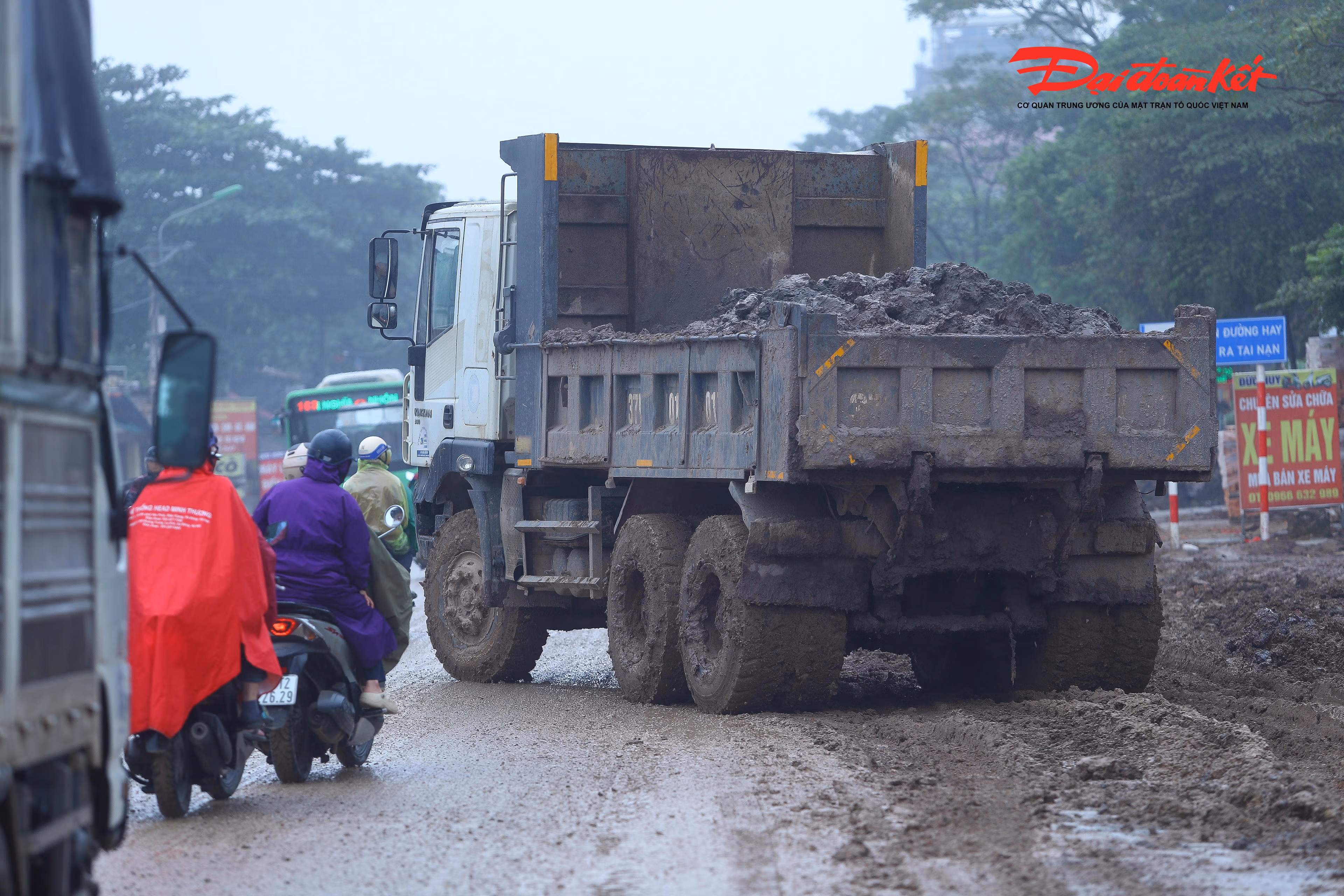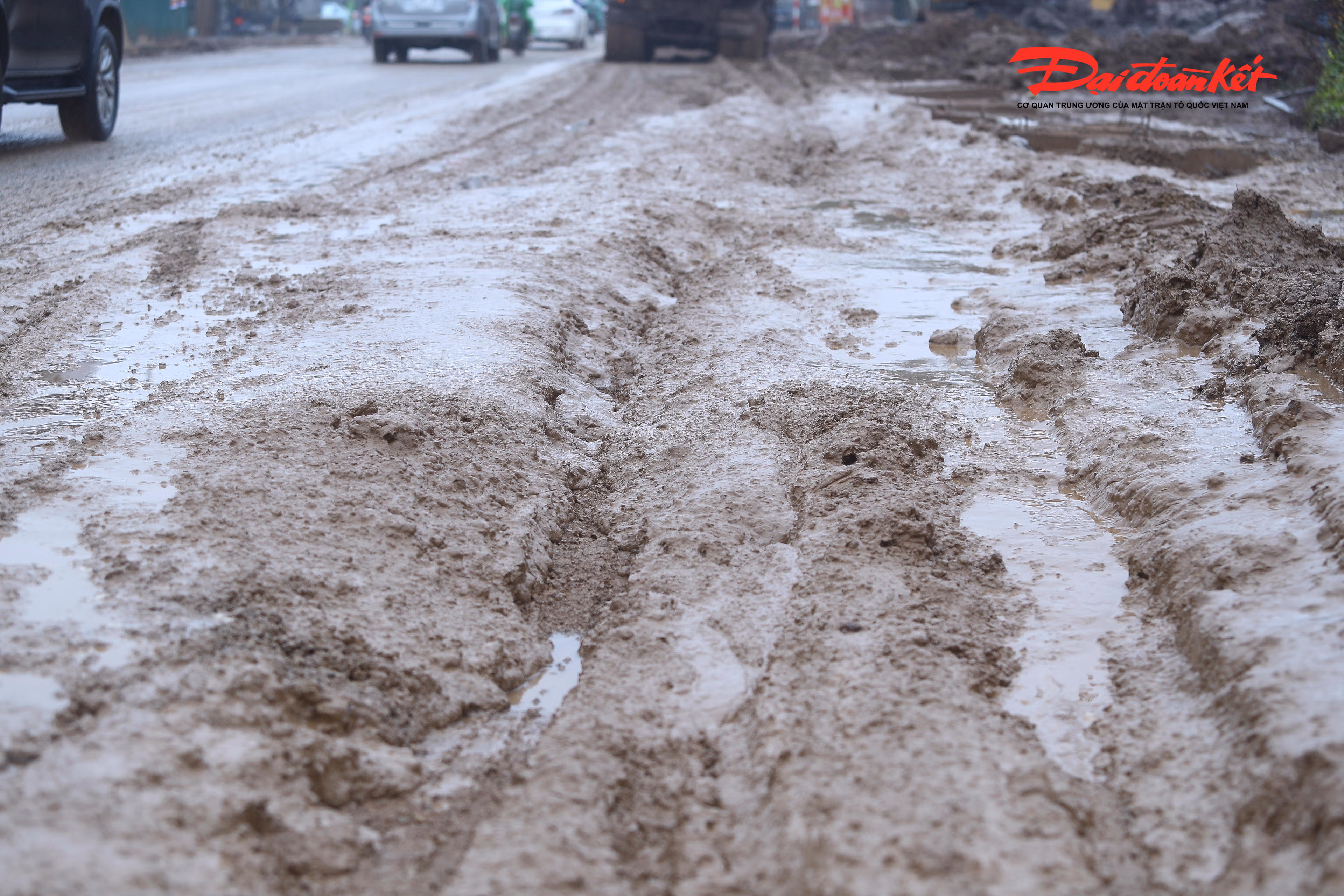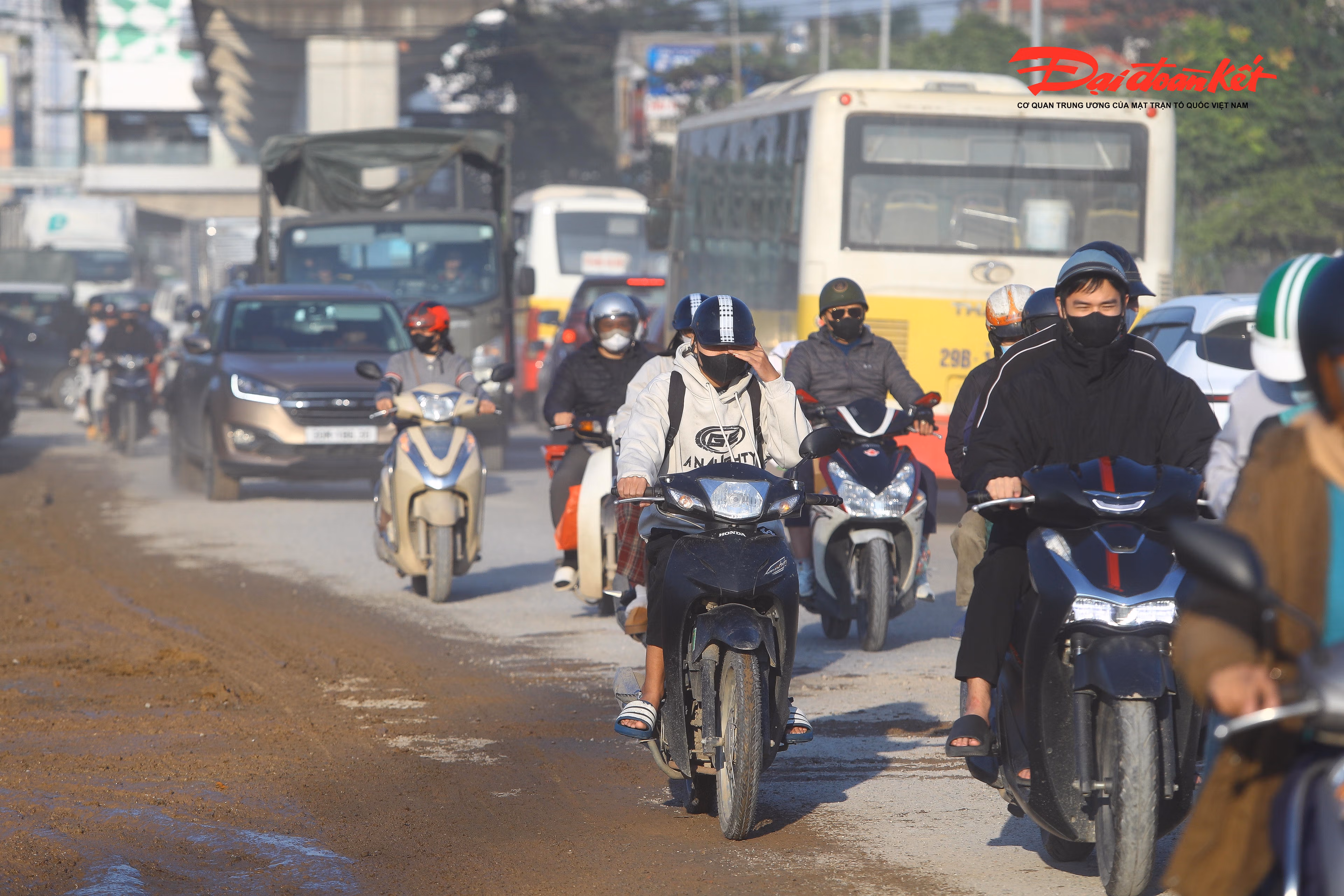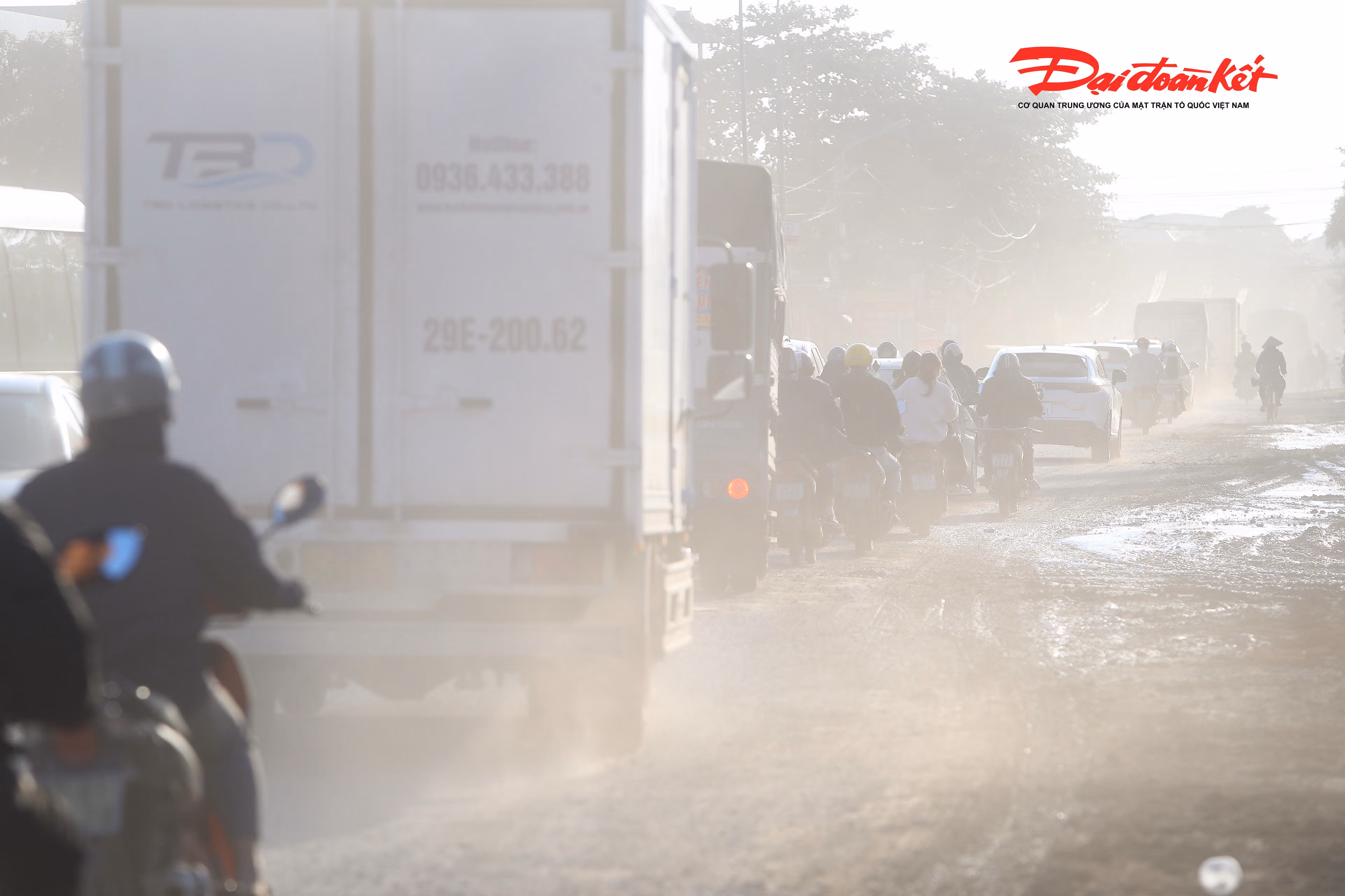 Còn vào ngày nắng, cả đoạn đường như chìm trong sương mù, do lớp bùn khô bám trên mặt đường bị xe cộ chạy qua làm bụi bay mù mịt.