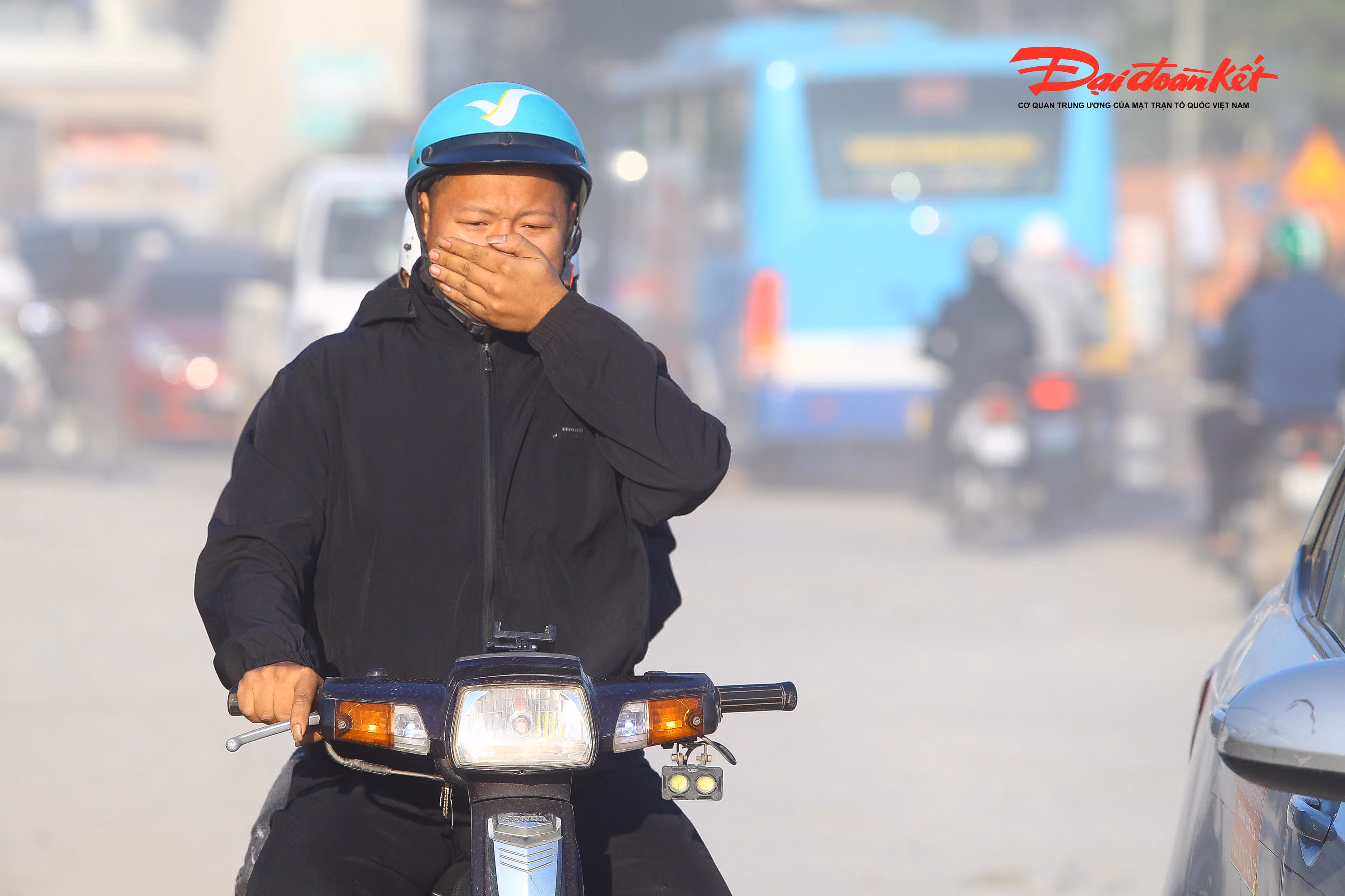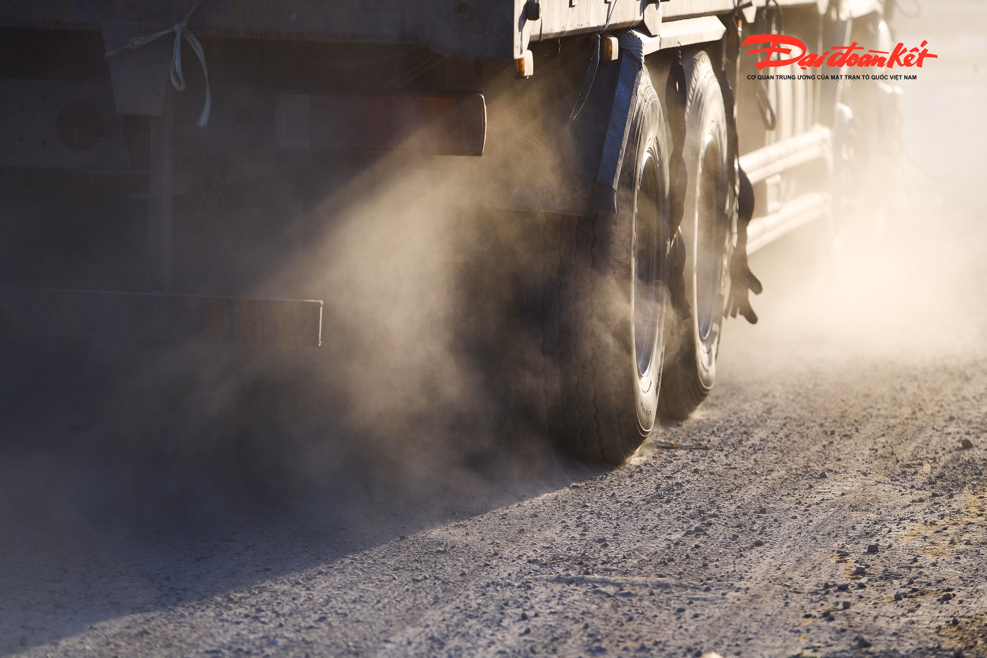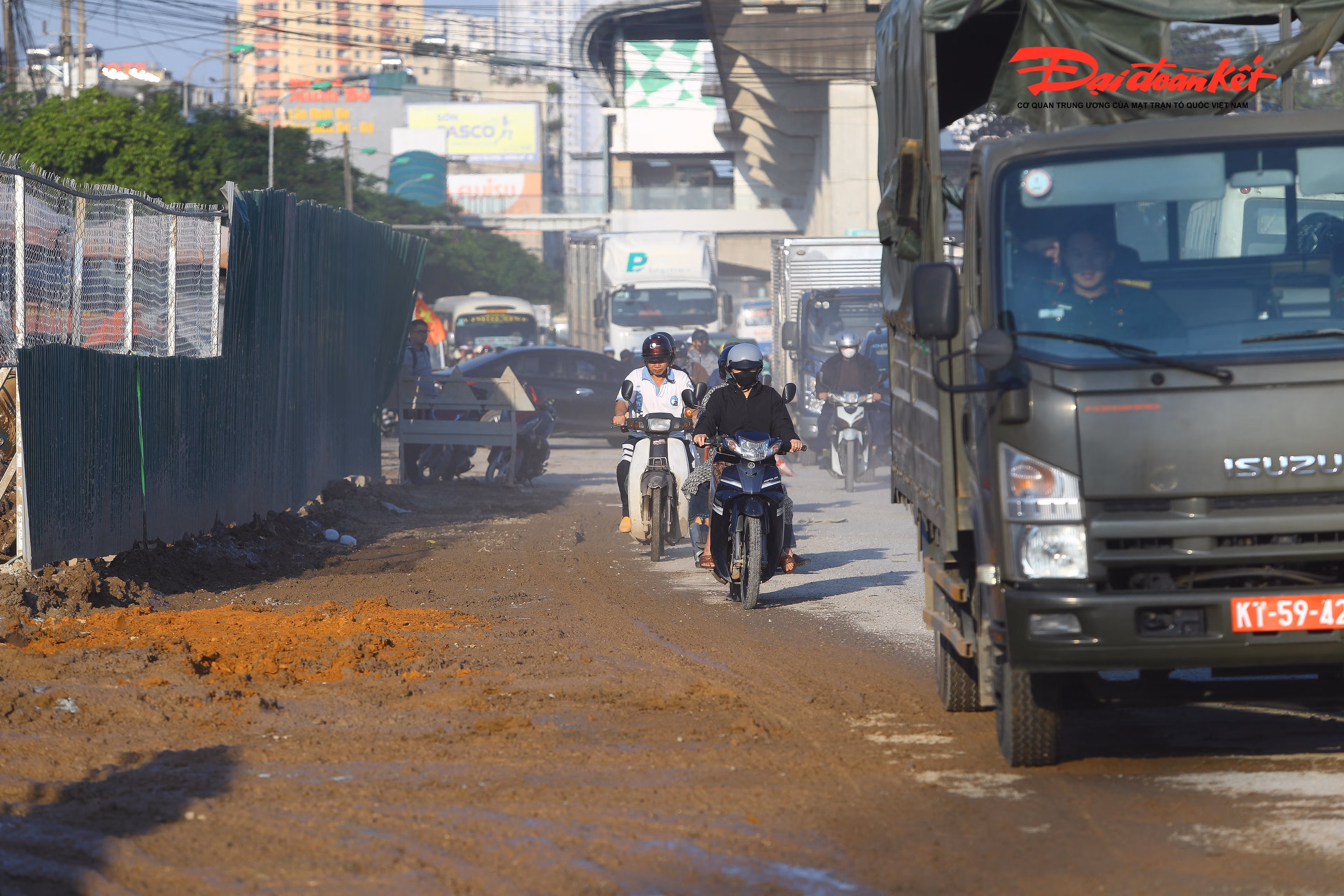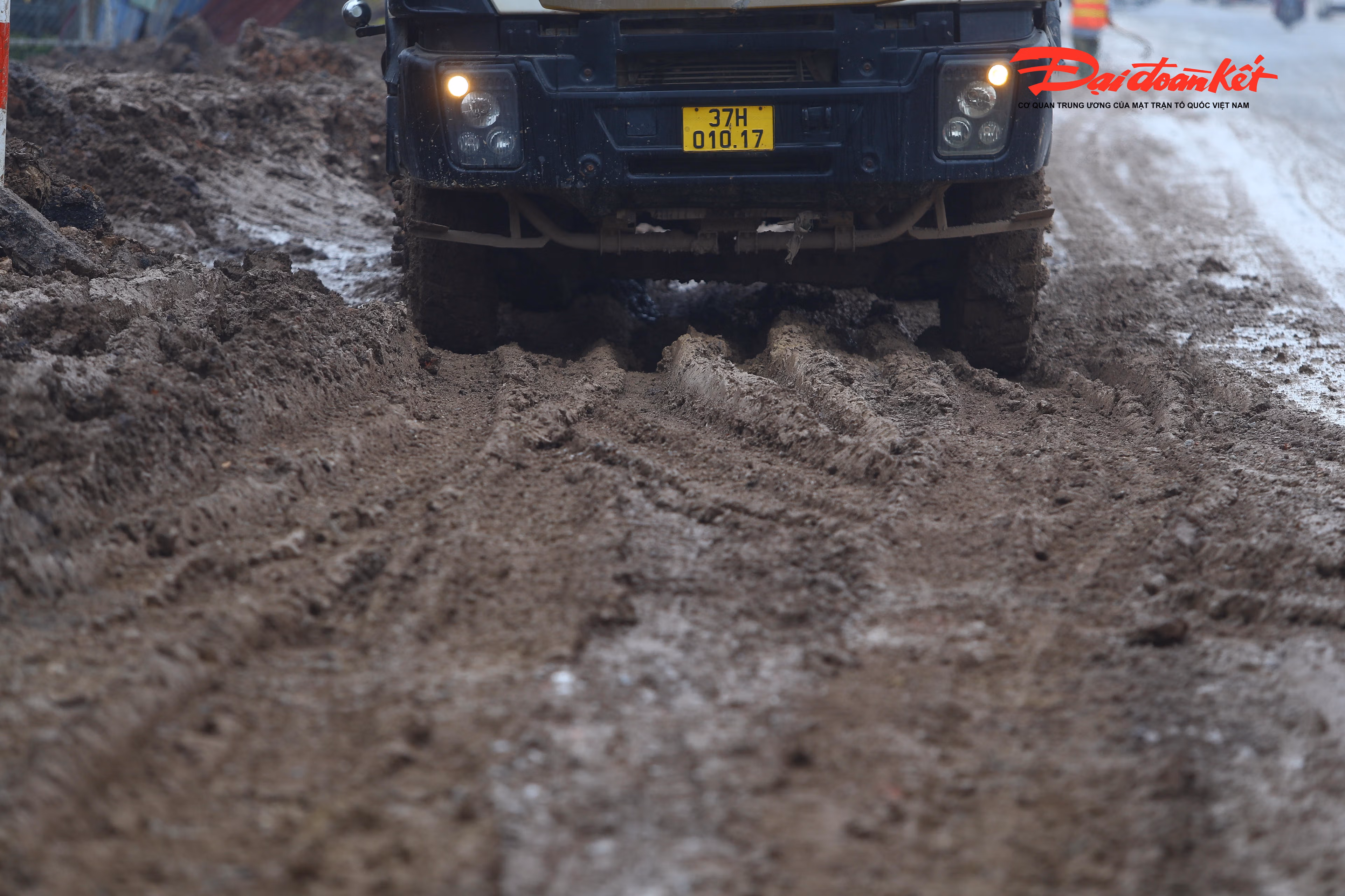 Còn vào ngày nắng, cả đoạn đường như chìm trong sương mù, do lớp bùn khô bám trên mặt đường bị xe cộ chạy qua làm bụi bay mù mịt.