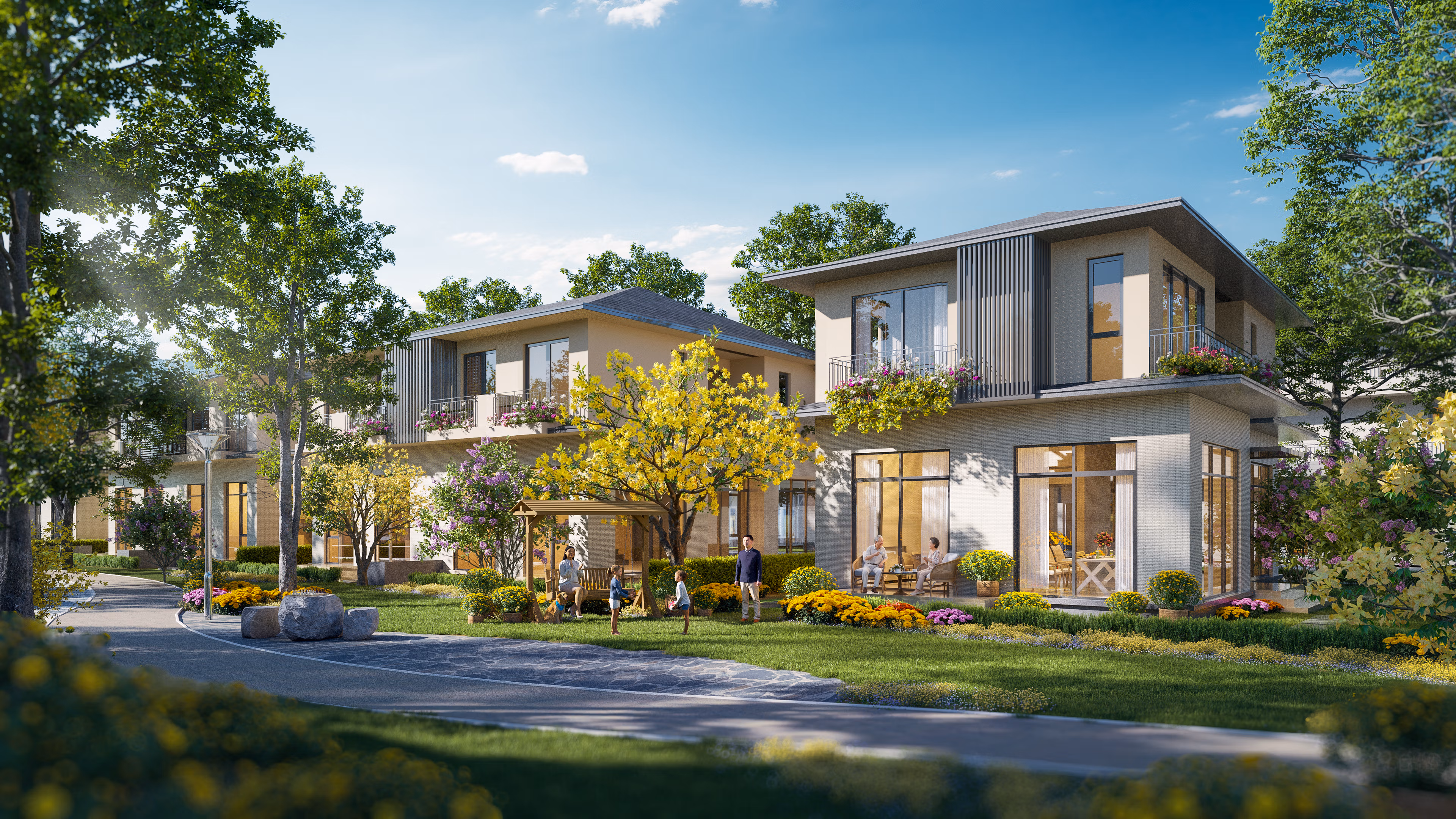 Mùa Lễ Hội cũng là phân khu đa dạng dòng sản phẩm bất động sản nhất: từ căn hộ cao tầng, trung tầng, thấp tầng đến nhà phố, biệt thự đơn lập, song lập, tứ lập – đáp ứng nhiều phong cách sống và nhu cầu khác biệt của cư dân. Đây cũng là phân khu đáp ứng 55% chỉ tiêu dân số toàn khu đô thị.