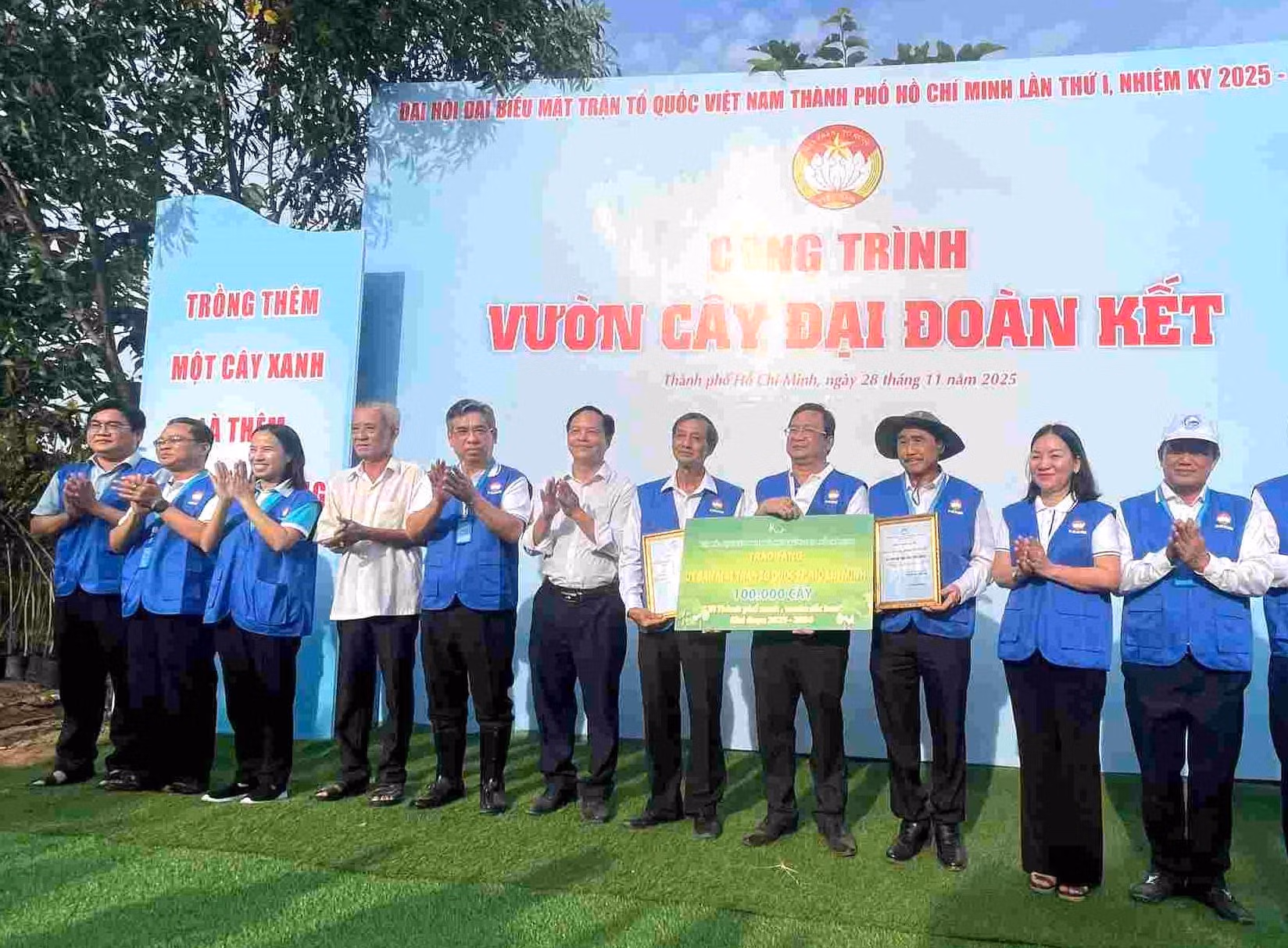 Tại chương trình, ông Đặng Văn Khoa - Chủ tịch Hội Bảo vệ Thiên nhiên và Môi trường TP Hồ Chí Minh, trao bảng tượng trưng tặng 100.000 cây xanh cho Mặt trận thành phố thực hiện phong trào “Thành phố muôn sắc hoa”.