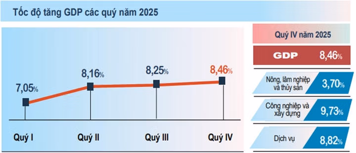 Báo cáo tình hình kinh tế xã hội quý IV và năm 2025 của Cục Thống kê cho thấy, GDP quý IV/2025 ước tăng 8,46% so với cùng kỳ năm trước, đạt mức tăng cao nhất của quý IV các năm trong giai đoạn 2011 - 2025, duy trì xu hướng quý sau cao hơn quý trước (quý I tăng 7,05%, quý II tăng 8,16%, quý III tăng 8,25%).