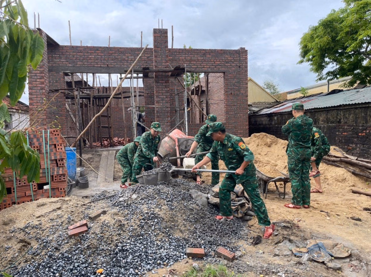 Những ngày cuối tháng 5, những ngôi làng ven biển ở phường Bình Ngọc (TP Móng Cái) nắng như đổ lửa. Chúng tôi tìm đến nhà bà Vũ Thị Tâm ở thôn 4, phường Bình Ngọc. Từ đầu ngõ, đã thấy thấp thoáng bóng áo rằn ri xanh của các anh Bộ đội Biên phòng. Người xách vữa, người bê gạch, người đẩy từng xe cát tới chân công trình… Những giọt mồ hôi lăn dài trên má.