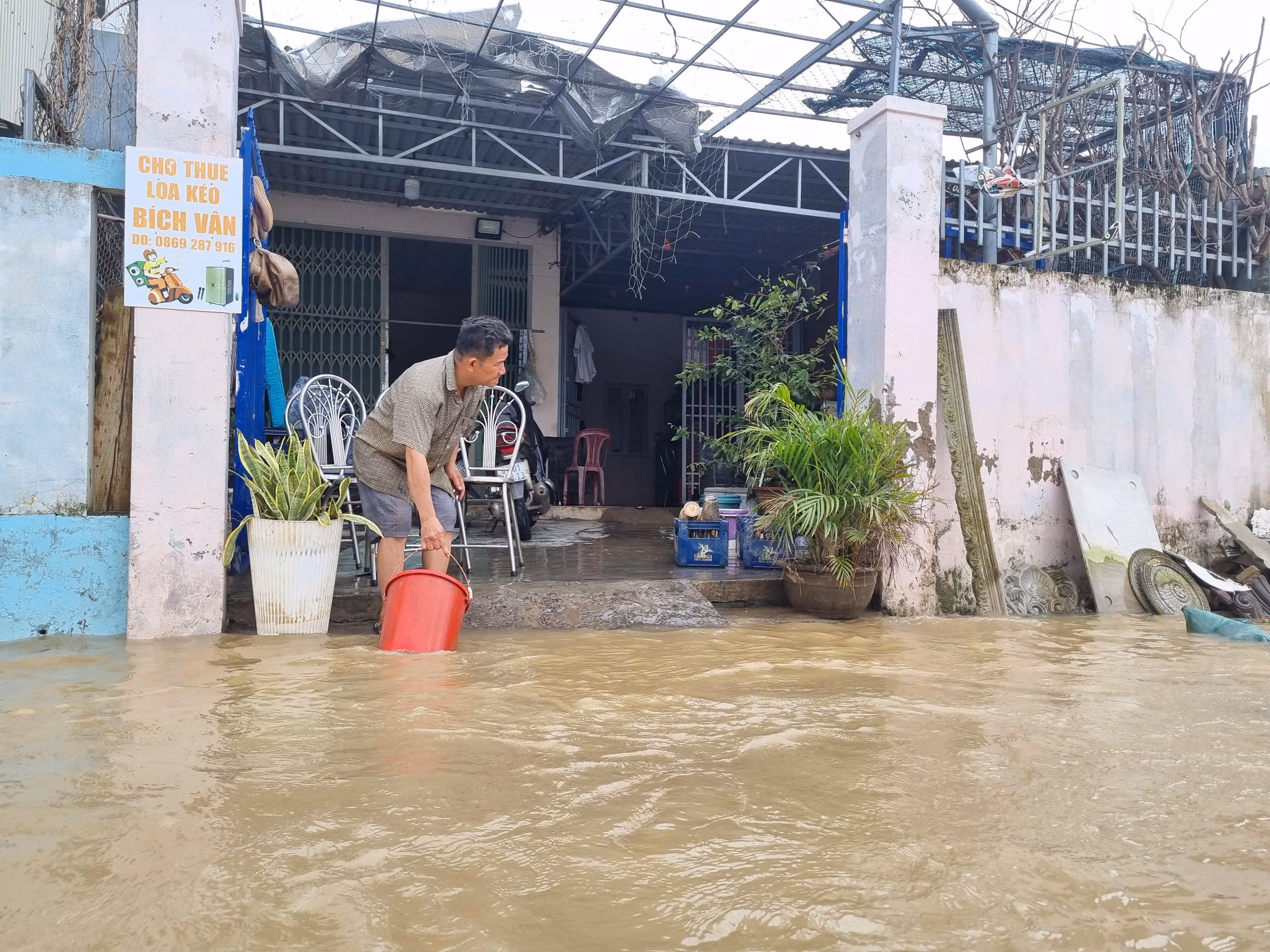 Ông Nguyễn Thanh Tuấn, ở phường Quy Nhơn Đông, tỉnh Gia Lai cho biết, khoảng 19h ngày 23/11, nước bắt đầu dâng trước cửa nhà, đến 4h sáng ngày 24/11, thì lên nhanh gần tới đầu gối, tràn vào sân.