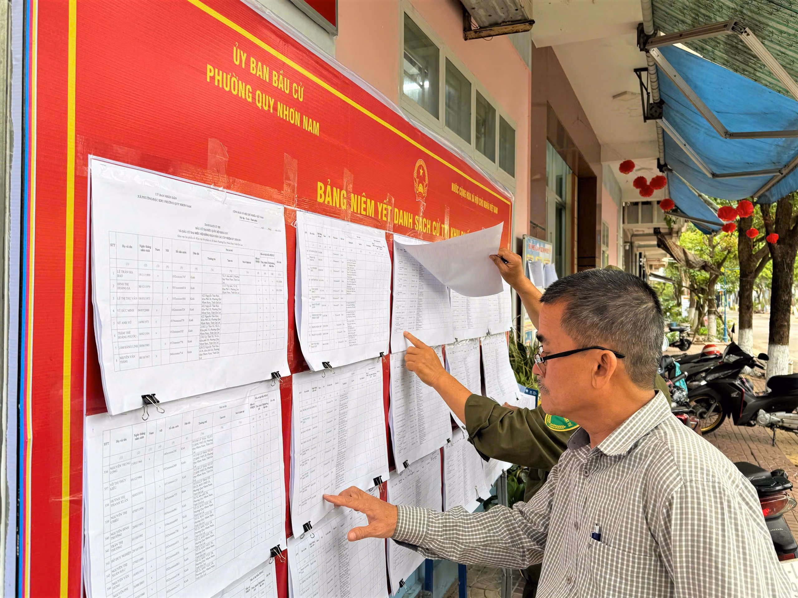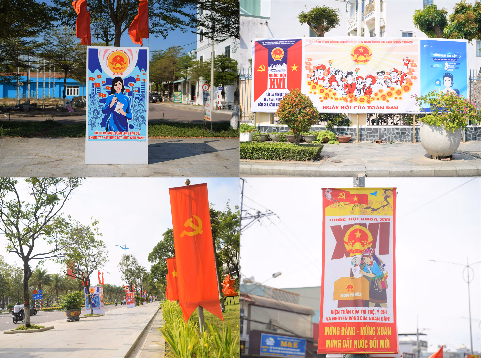 Tại dọc các tuyến đường trung tâm phường Quy Nhơn, hàng trăm tấm pano cỡ lớn cùng nhiều băng rôn, khẩu hiệu được treo trang trọng, tuyên truyền cho ngày hội lớn của toàn dân.