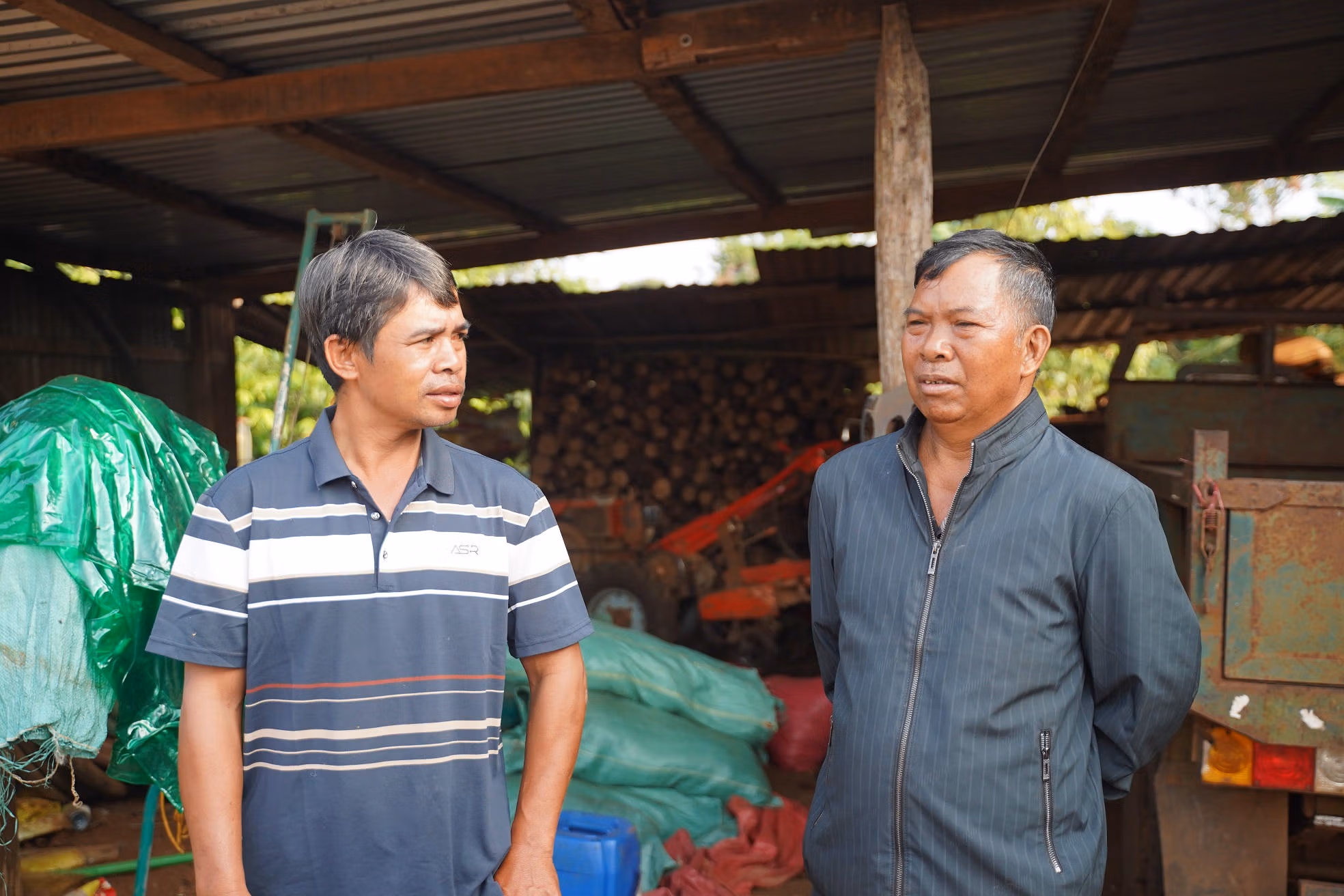 Già làng Ksor Alunh (bên phải) tuyên truyền bầu cử tới các cử tri. Ảnh: Đình Sang.