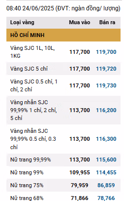 Riêng tại Phú Quý, vàng miếng SJC vẫn tiếp tục được mua vào thấp hơn so với các thương hiệu khác 700.000 đồng/lượng chiều mua vào, niêm yết ở mức 117,0 - 119,7 triệu đồng/lượng (mua vào - bán ra).