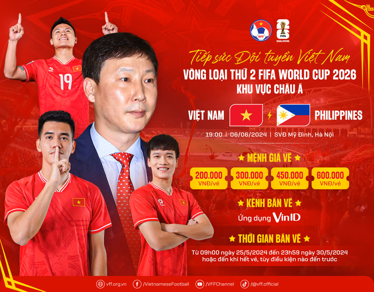 Ngày 23/5, Liên đoàn Bóng đá Việt Nam thông báo kế hoạch bán vé trận đấu giữa đội tuyển Việt Nam và đội tuyển Philippines trên sân nhà của đội tuyển Việt Nam, thuộc vòng loại thứ hai FIFA World Cup 2026, lúc 19h ngày 6/6/2024 trên sân vận động quốc gia Mỹ Đình - thành phố Hà Nội.