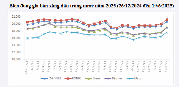 Bình quân giá thành phẩm xăng dầu thế giới giữa kỳ điều hành giá ngày 12/6/2025 và kỳ điều hành ngày 19/6/2025 là: 83,088 USD/thùng xăng RON92 dùng để pha chế xăng E5RON92 (tăng 6,340 USD/thùng, tương đương tăng 8,26%); 85,128 USD/thùng xăng RON95 (tăng 6,464 USD/thùng, tương đương tăng 8,22%); 87,578 USD/thùng dầu hỏa (tăng 7,838 USD/thùng, tương đương tăng 9,83%); 89,556 USD/thùng dầu diesel 0,05S (tăng 8,050 USD/thùng, tương đương tăng 9,88%); 476,846 USD/tấn dầu mazut 180CST 3,5S (tăng 40,694 USD/tấn, tương đương tăng 9,33%).