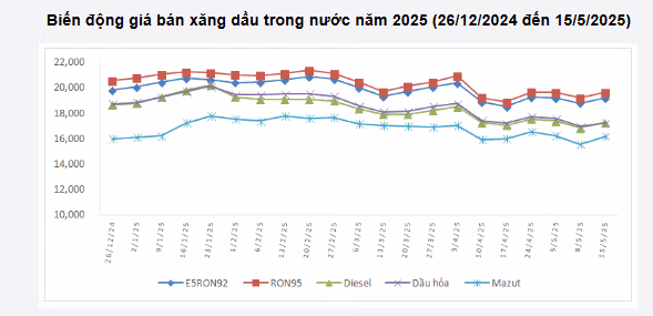 Bình quân giá thành phẩm xăng dầu thế giới giữa kỳ điều hành giá ngày 08/5/2025 và kỳ điều hành ngày 15/5/2025 là: 75,493 USD/thùng xăng RON92 dùng để pha chế xăng E5RON92 (tăng 2,213 USD/thùng, tương đương tăng 3,02%); 76,993 USD/thùng xăng RON95 (tăng 2,130 USD/thùng, tương đương tăng 2,85%); 78,380 USD/thùng dầu hỏa (tăng 1,600 USD/thùng, tương đương tăng 2,08%); 79,113 USD/thùng dầu diezel 0,05S (tăng 2,343 USD/thùng, tương đương tăng 3,05%); 426,983 USD/tấn dầu mazut 180CST 3,5S (tăng 21,826 USD/tấn, tương đương tăng 5,39%).