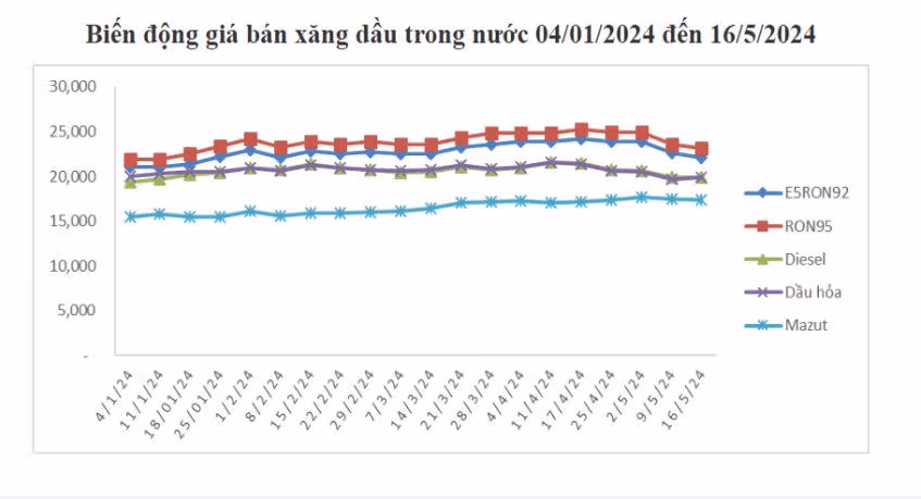 Từ 15h ngày 16/5/2024, liên Bộ Công Thương - Tài chính đã có quyết định điều chỉnh giá bán lẻ xăng dầu. Cụ thể:
