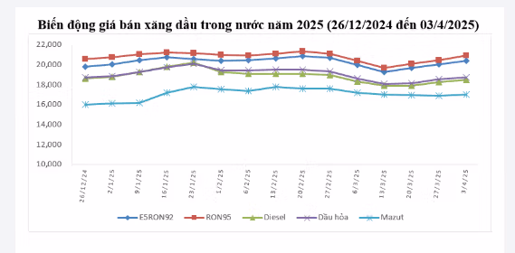 Bình quân giá thành phẩm xăng dầu thế giới giữa kỳ điều hành giá ngày 27/3/2025 và kỳ điều hành ngày 03/4/2025 là: 83,123 USD/thùng xăng RON92 dùng để pha chế xăng E5RON92 (tăng 2,107 USD/thùng, tương đương tăng 2,60%); 84,865 USD/thùng xăng RON95 (tăng 2,557 USD/thùng, tương đương tăng 3,11%); 87,460 USD/thùng dầu hỏa (tăng 1,156 USD/thùng, tương đương tăng 1,34%); 87,198 USD/thùng dầu điêzen 0,05S (tăng 1,438 USD/thùng, tương đương tăng 1,68%); 463,715 USD/tấn dầu mazut 180CST 3,5S (tăng 4,113 USD/tấn, tương đương tăng 0,89%).