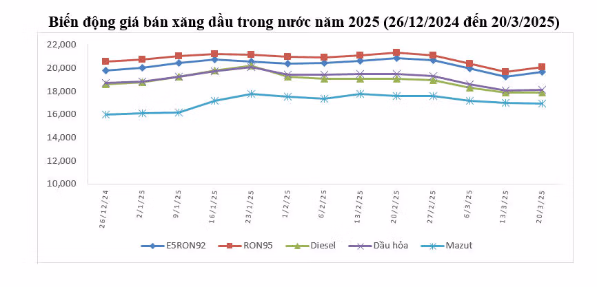 Bình quân giá thành phẩm xăng dầu thế giới giữa kỳ điều hành giá ngày 13/3/2025 và kỳ điều hành ngày 20/3/2025 là: 79,334 USD/thùng xăng RON92 dùng để pha chế xăng E5RON92 (tăng 2,194 USD/thùng, tương đương tăng 2,84%); 80,754 USD/thùng xăng RON95 (tăng 2,162 USD/thùng, tương đương tăng 2,75%); 84,206 USD/thùng dầu hỏa (tăng 0,024 USD/thùng, tương đương tăng 0,03%); 84,136 USD/thùng dầu điêzen 0,05S (giảm 0,168 USD/thùng, tương đương giảm 0,20%); 462,612 USD/tấn dầu mazut 180CST 3,5S (giảm 2,180 USD/tấn, tương đương giảm 0,47%).